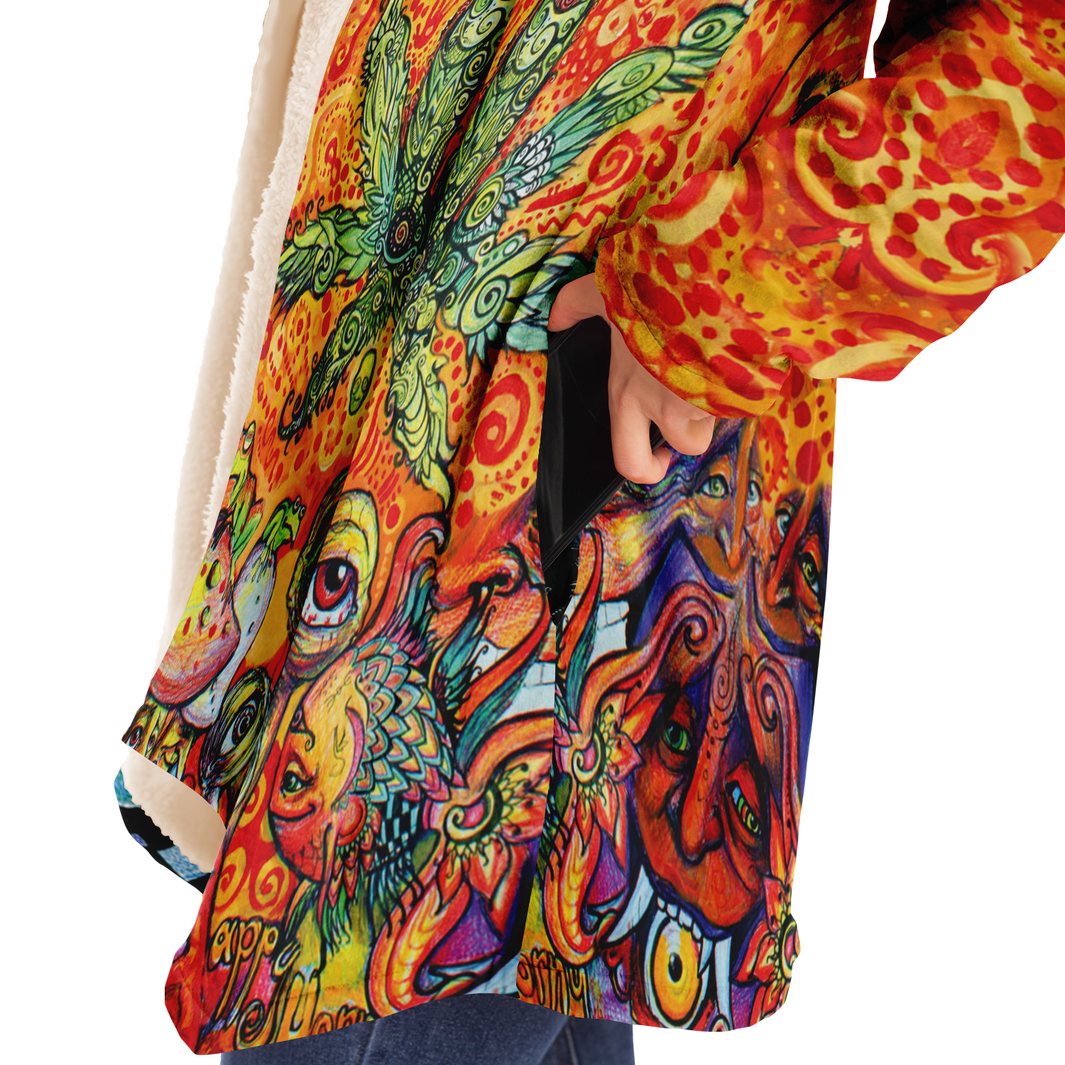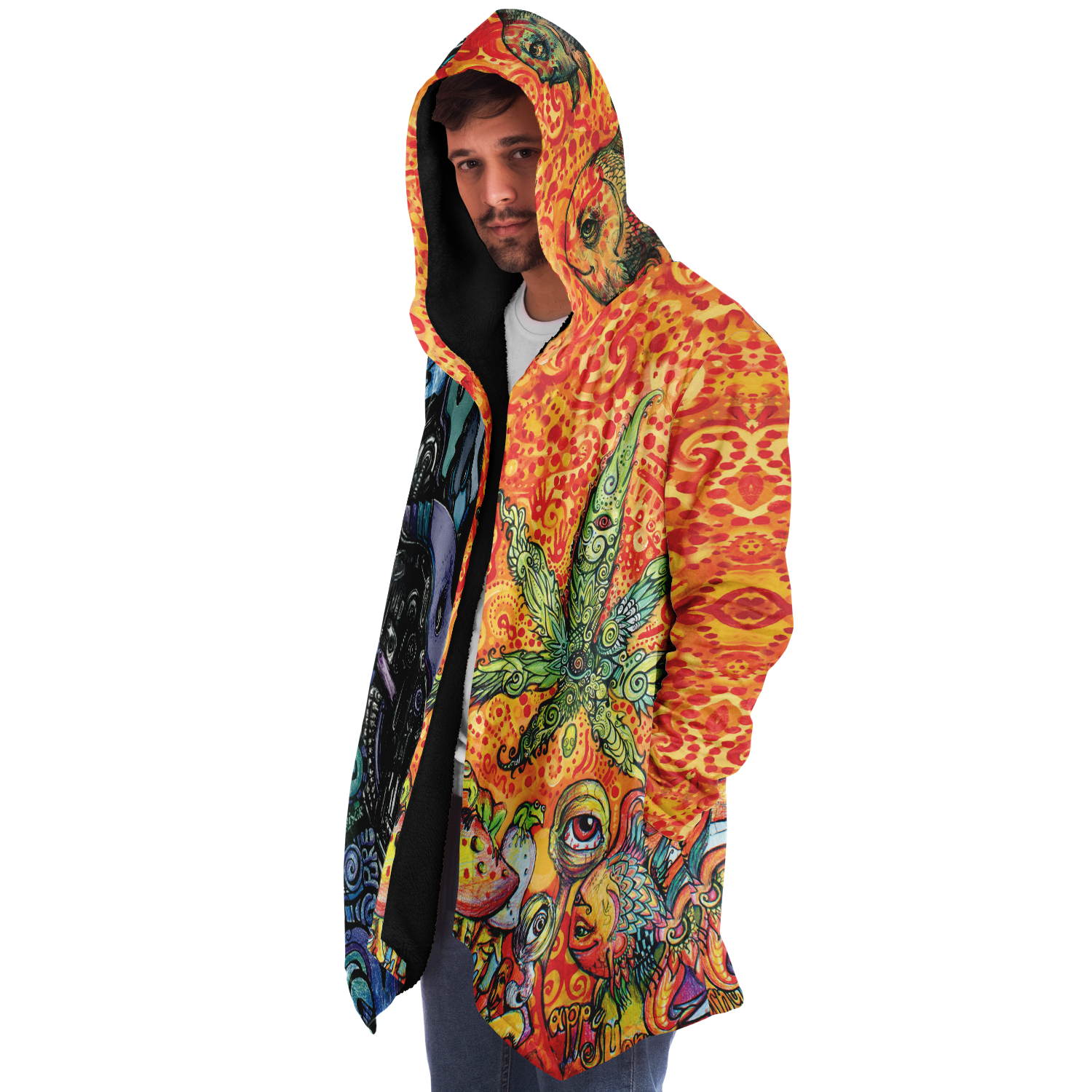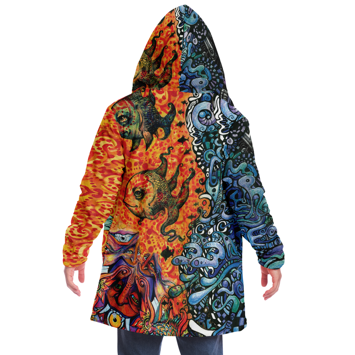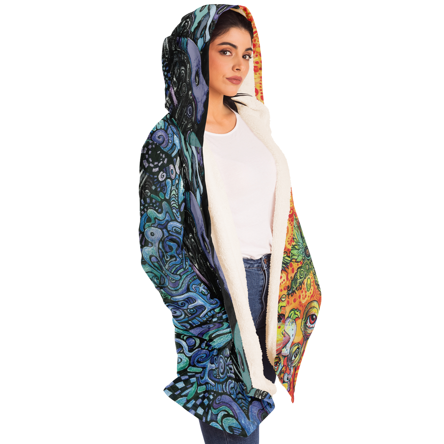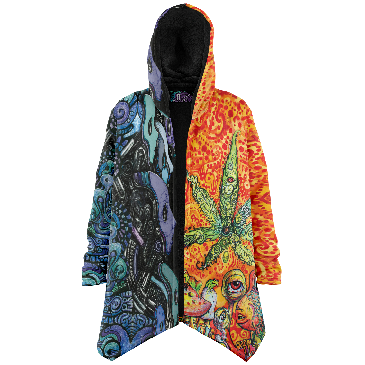 Made from 100% Micro-Mink Polyester, having a silky smooth surface. This allows every Art piece to stand out as one of a kind. Additionally, a layer of Microfiber Fleece is added.This semi plush fleece is buttery soft feeling that lines the torso, sleeves, and hood! Overall a medium weight build cloak with a large hood.