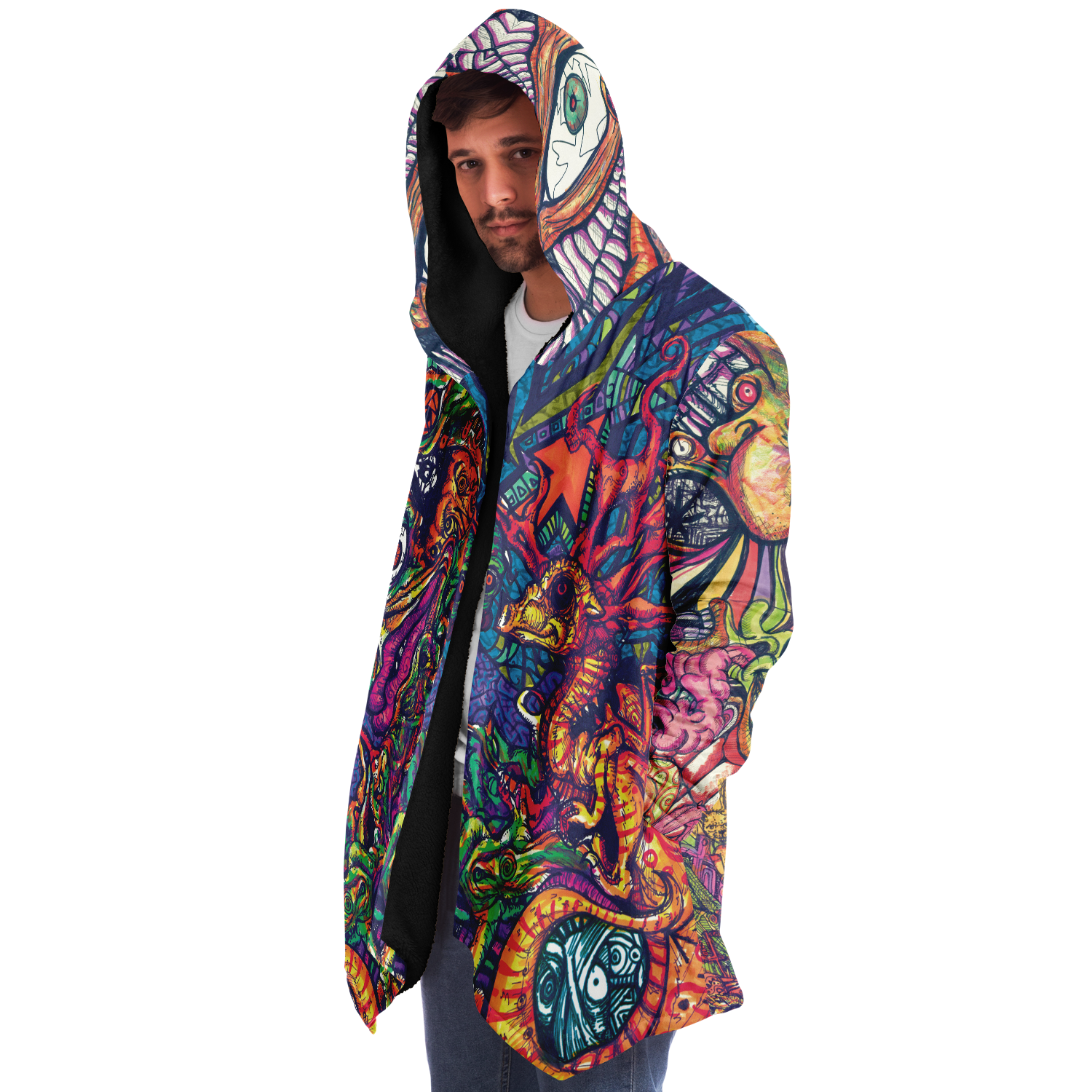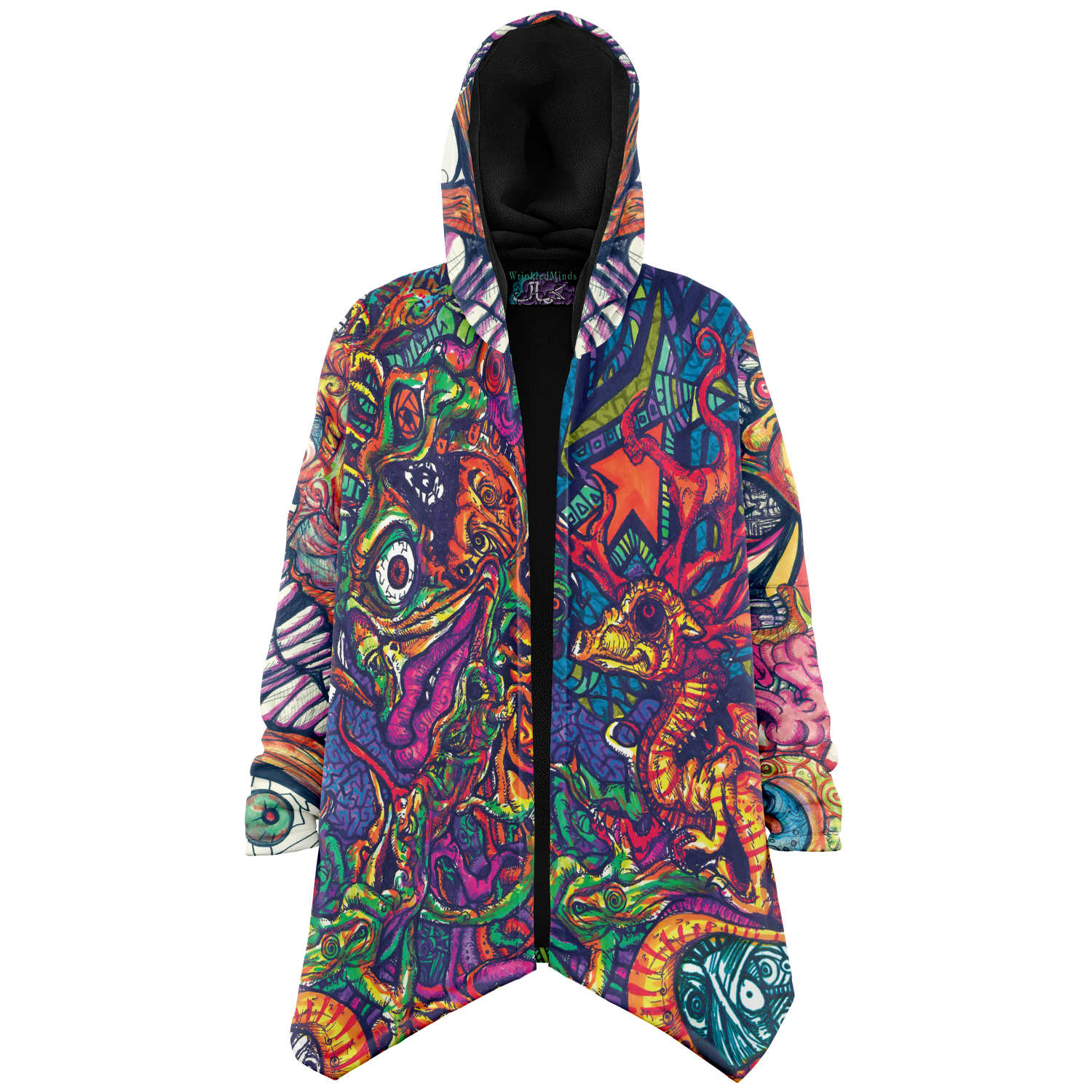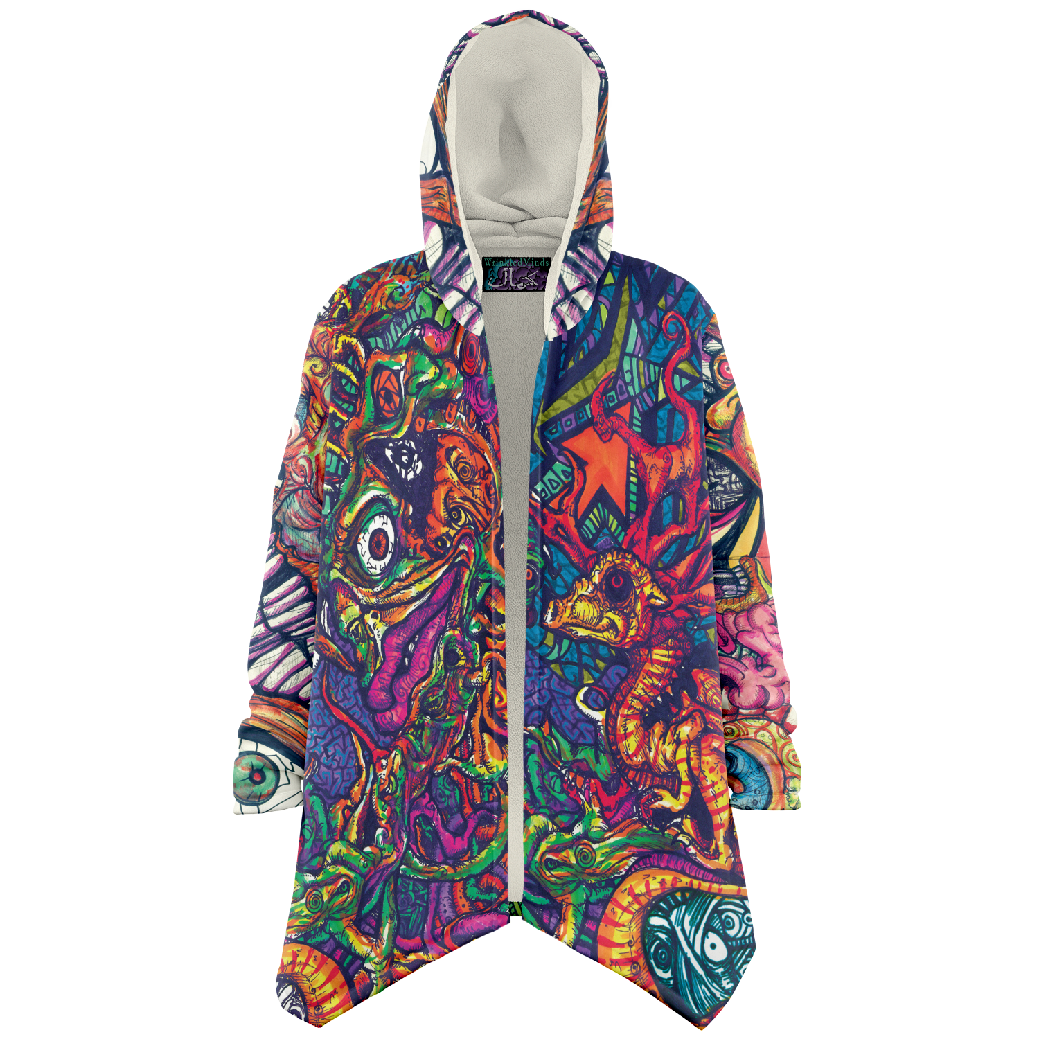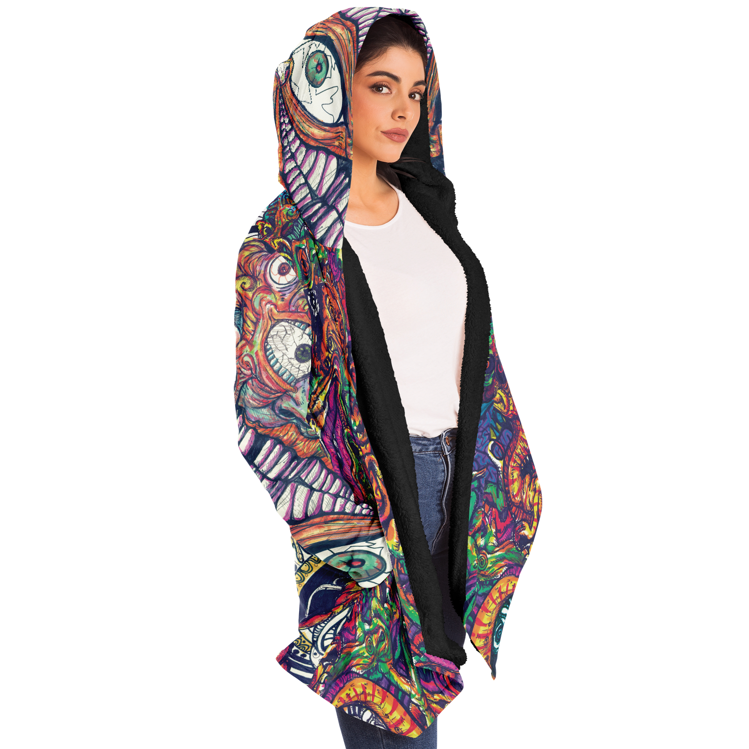 Made from 100% Micro-Mink Polyester, having a silky smooth surface. This allows every Art piece to stand out as one of a kind. Additionally, a layer of Microfiber Fleece is added.This semi plush fleece is buttery soft feeling that lines the torso, sleeves, and hood! Overall a medium weight build cloak with a large hood.