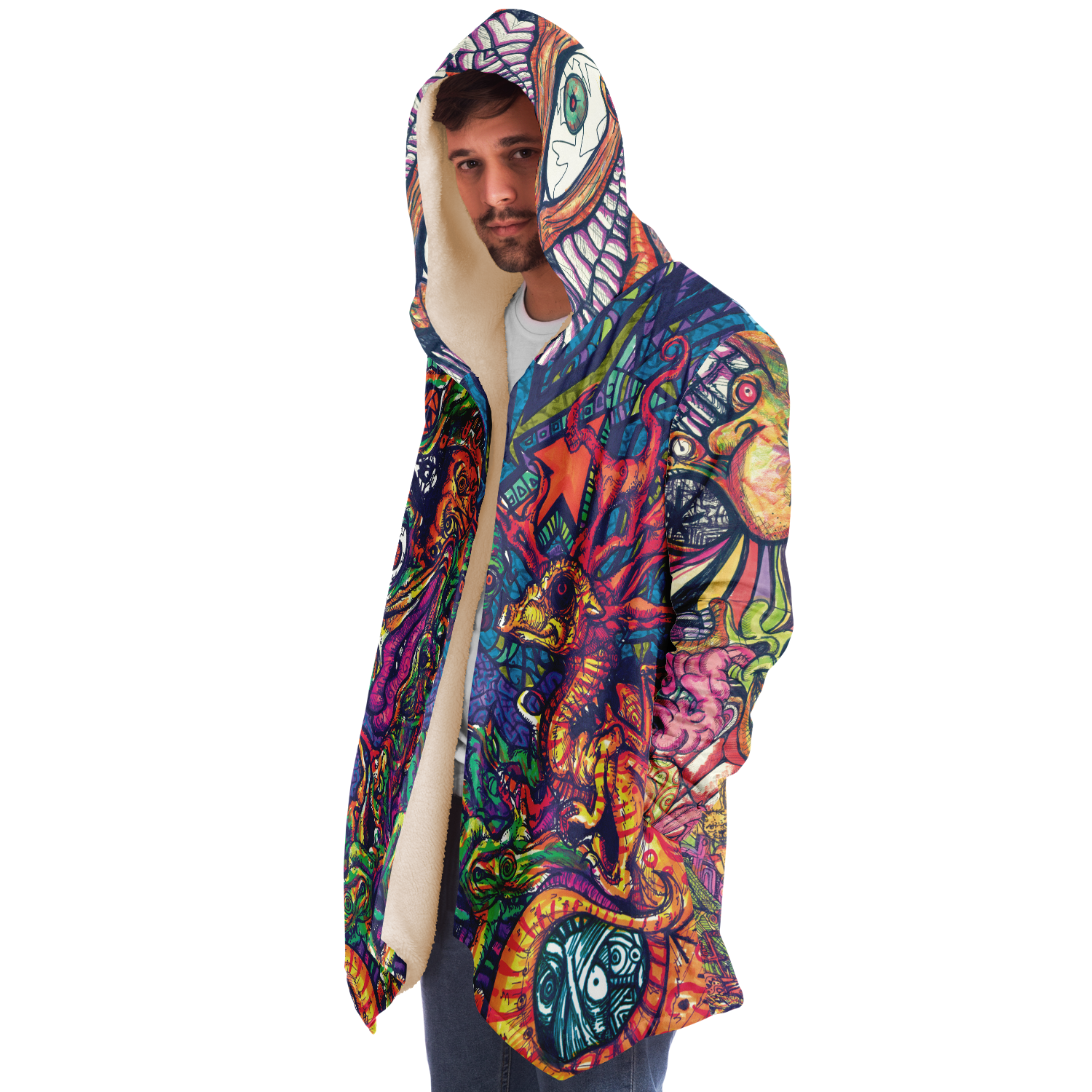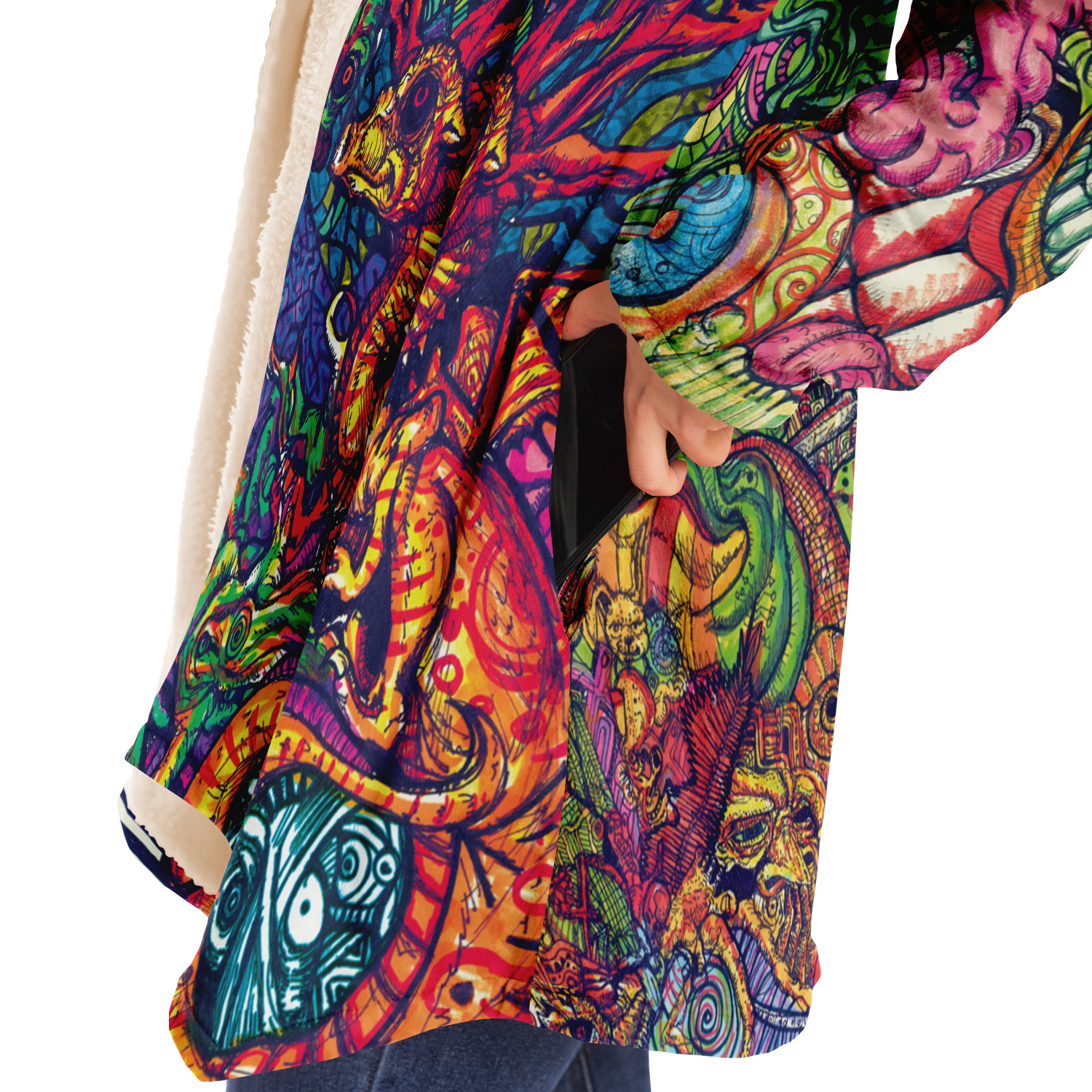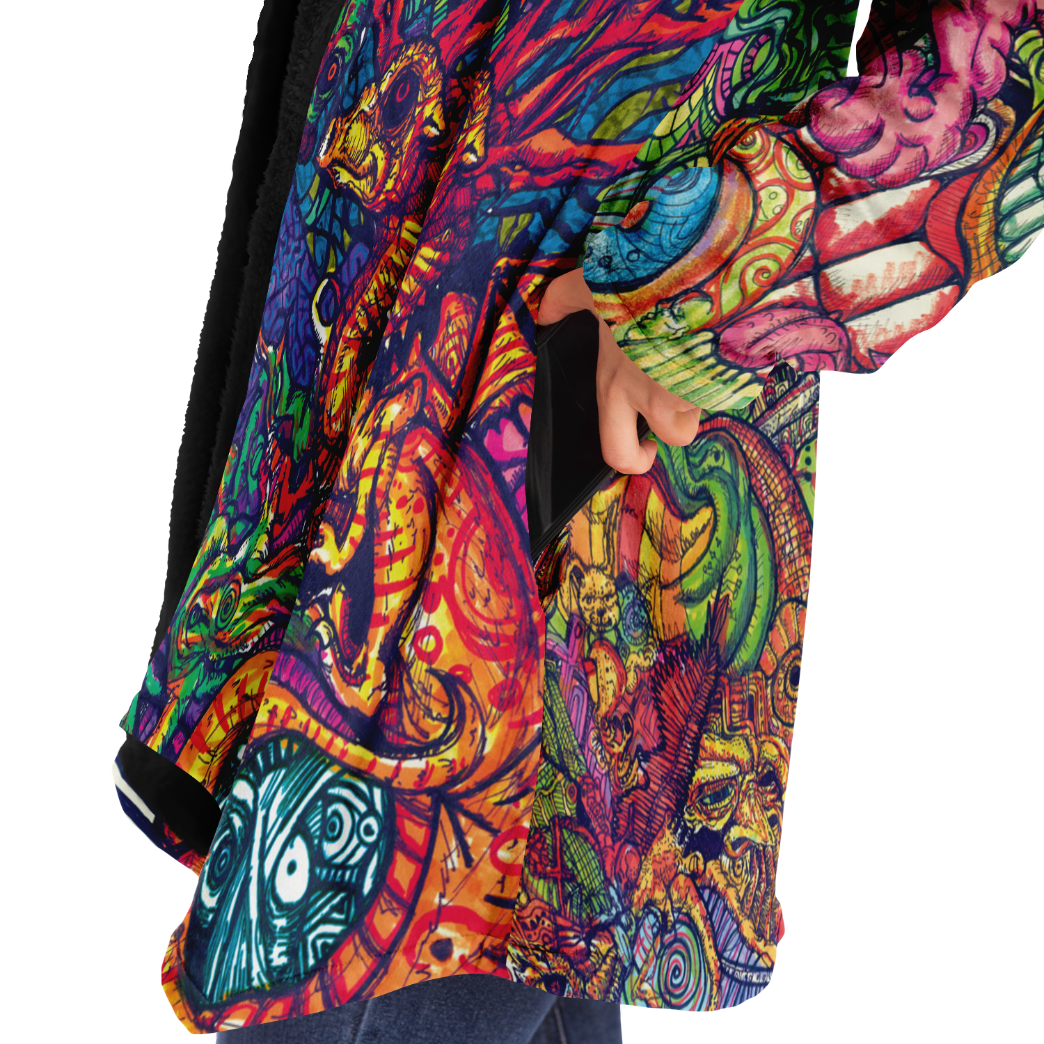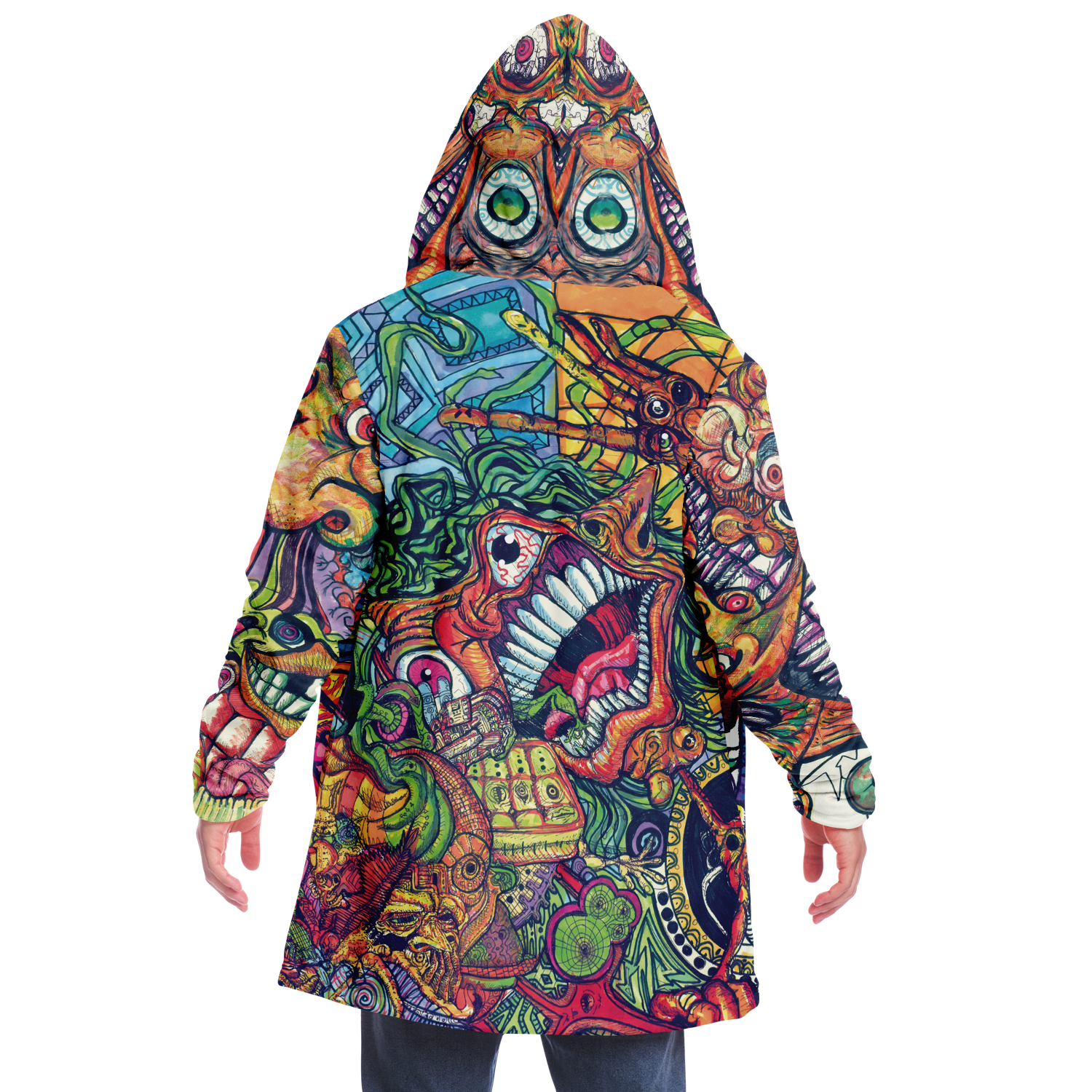 Made from 100% Micro-Mink Polyester, having a silky smooth surface. This allows every Art piece to stand out as one of a kind. Additionally, a layer of Microfiber Fleece is added.This semi plush fleece is buttery soft feeling that lines the torso, sleeves, and hood! Overall a medium weight build cloak with a large hood.