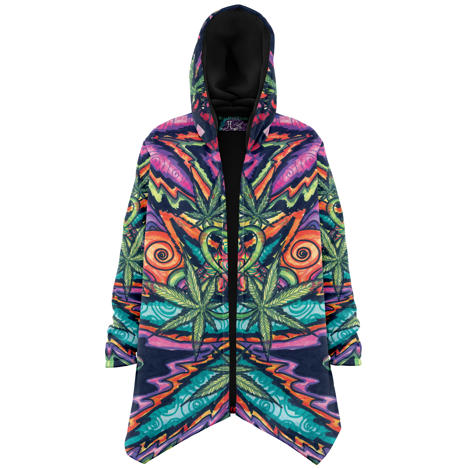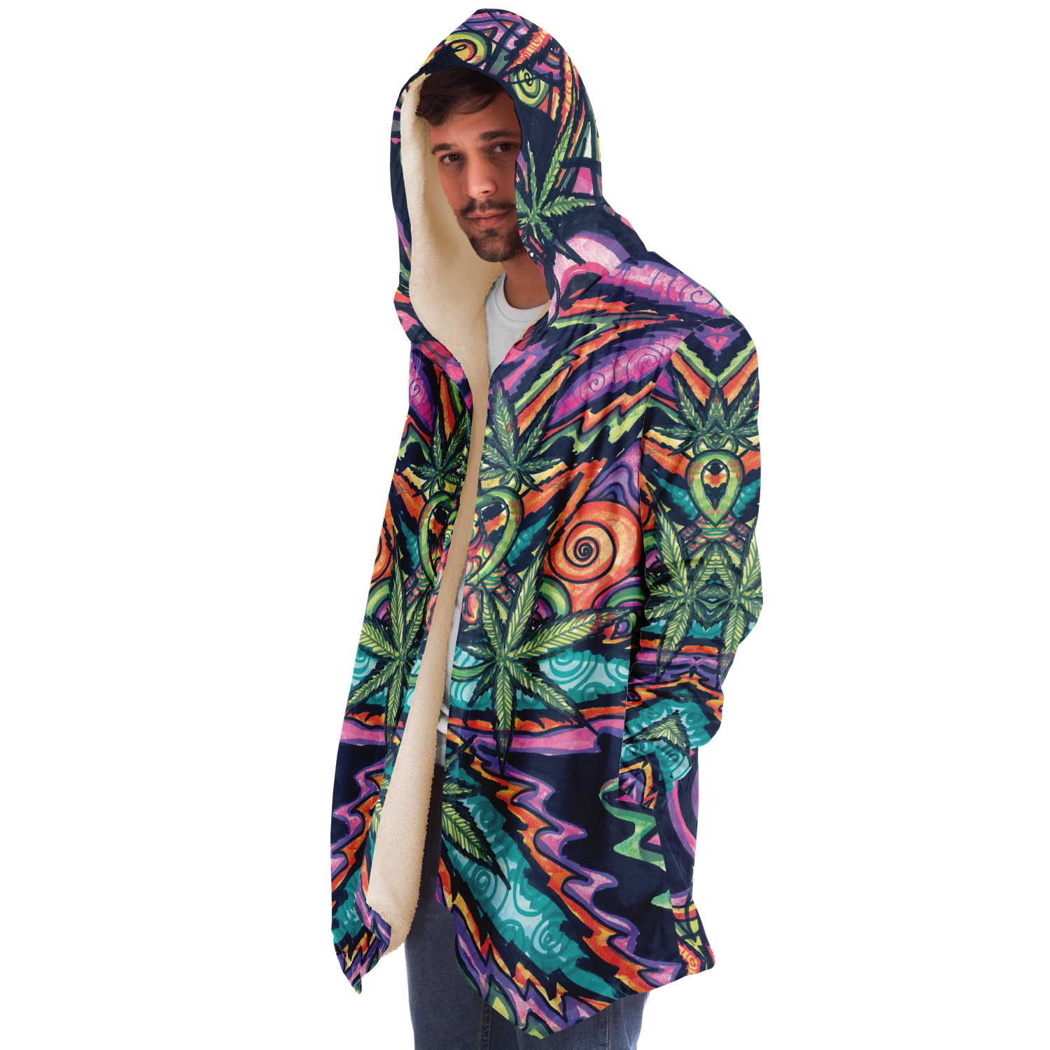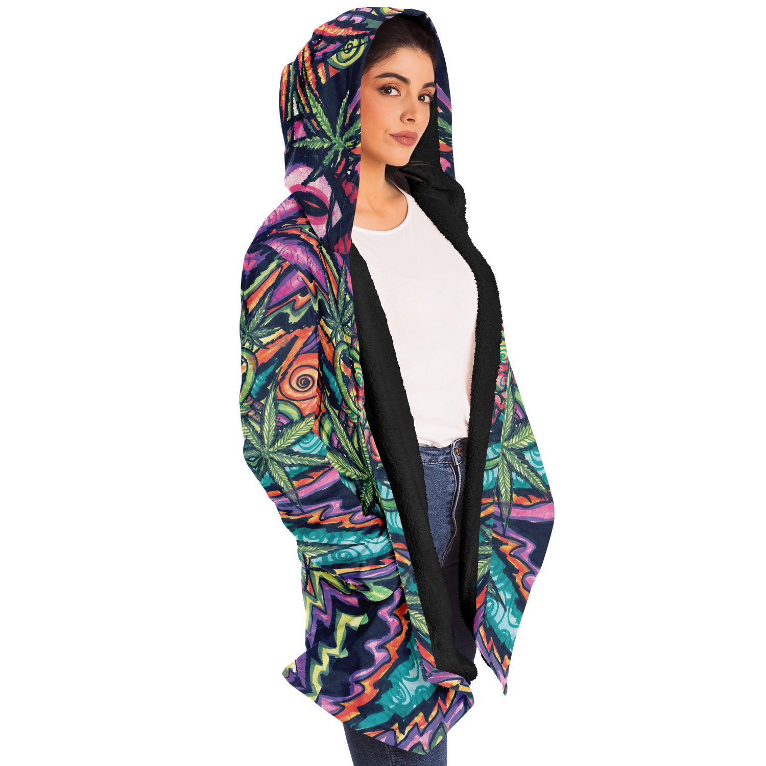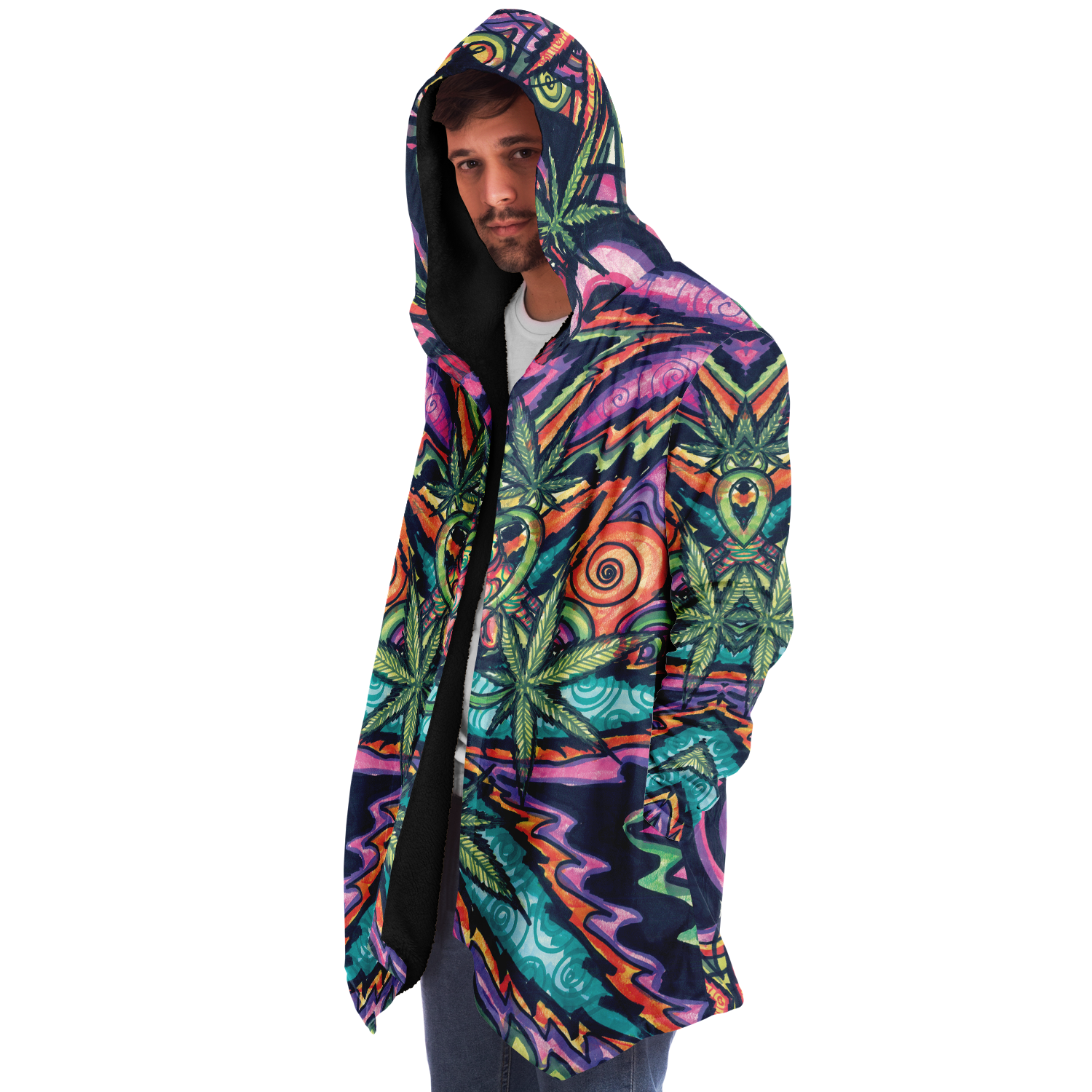 Made from 100% Micro-Mink Polyester, having a silky smooth surface. This allows every Art piece to stand out as one of a kind. Additionally, a layer of Microfiber Fleece is added.This semi plush fleece is buttery soft feeling that lines the torso, sleeves, and hood! Overall a medium weight build cloak with a large hood.