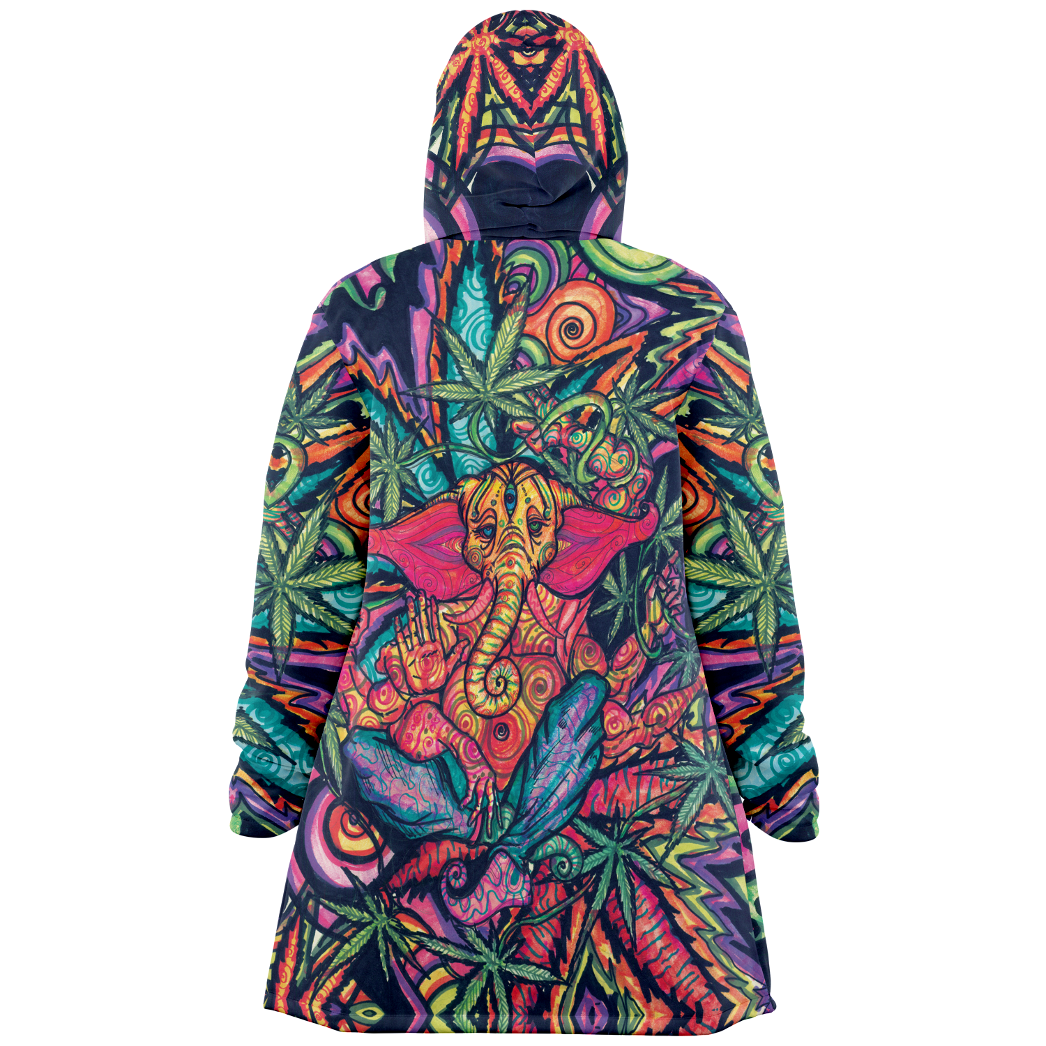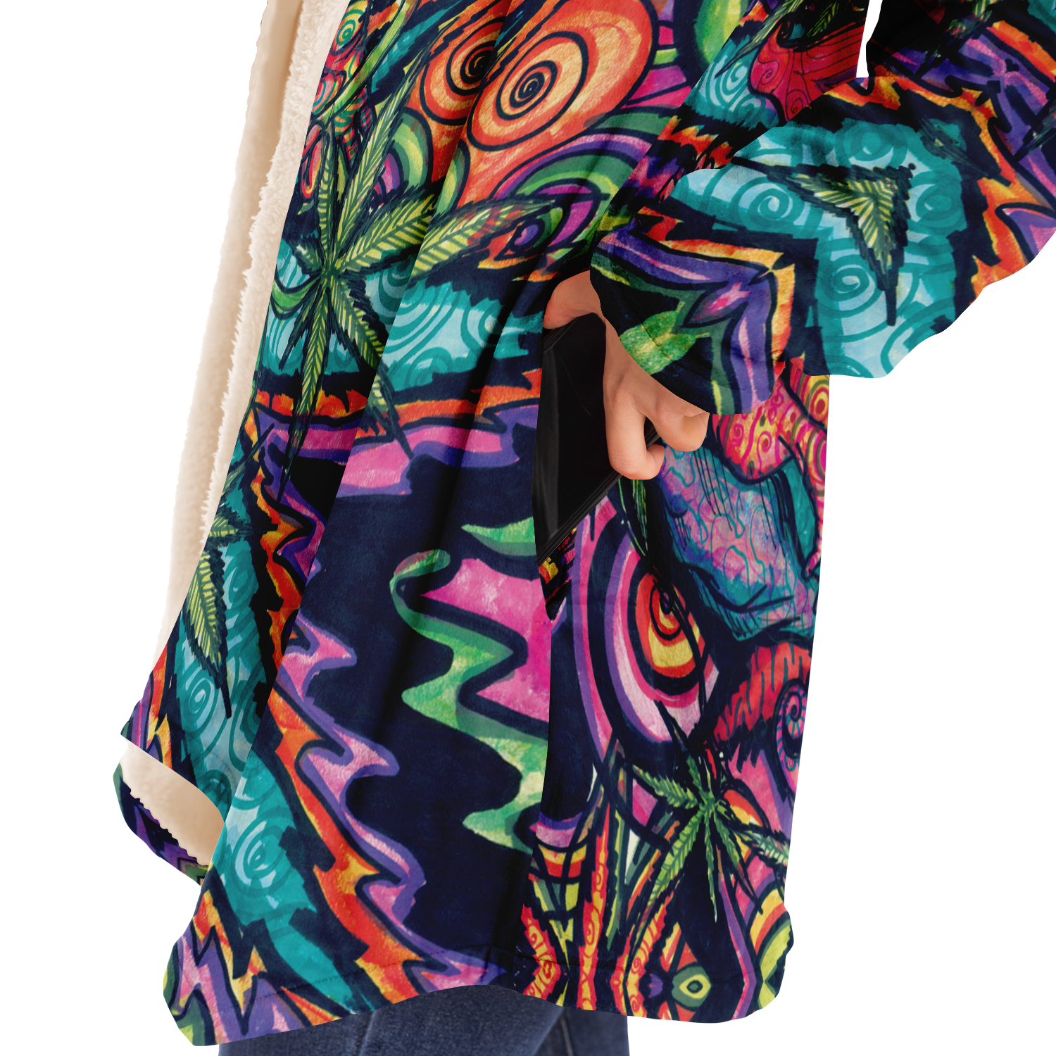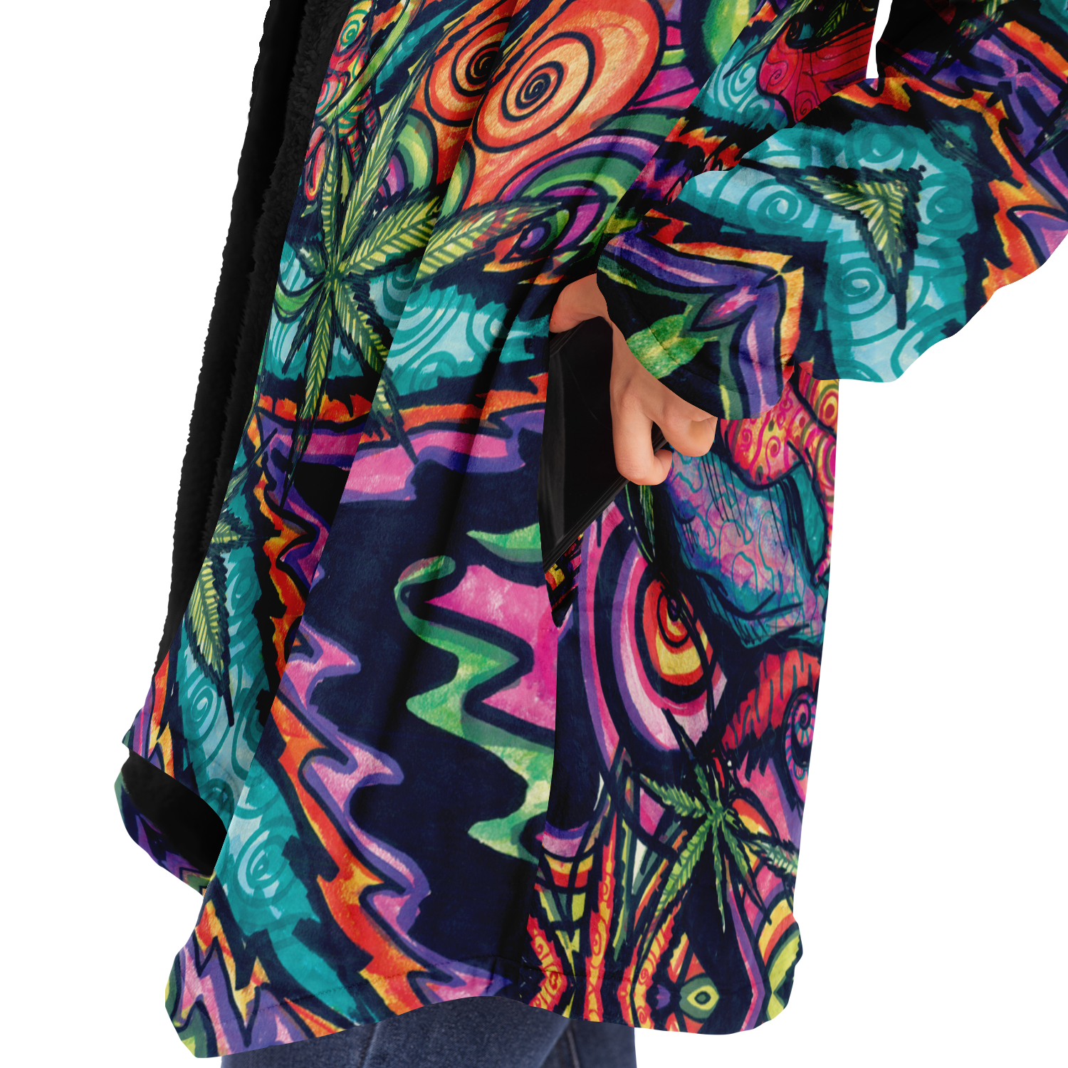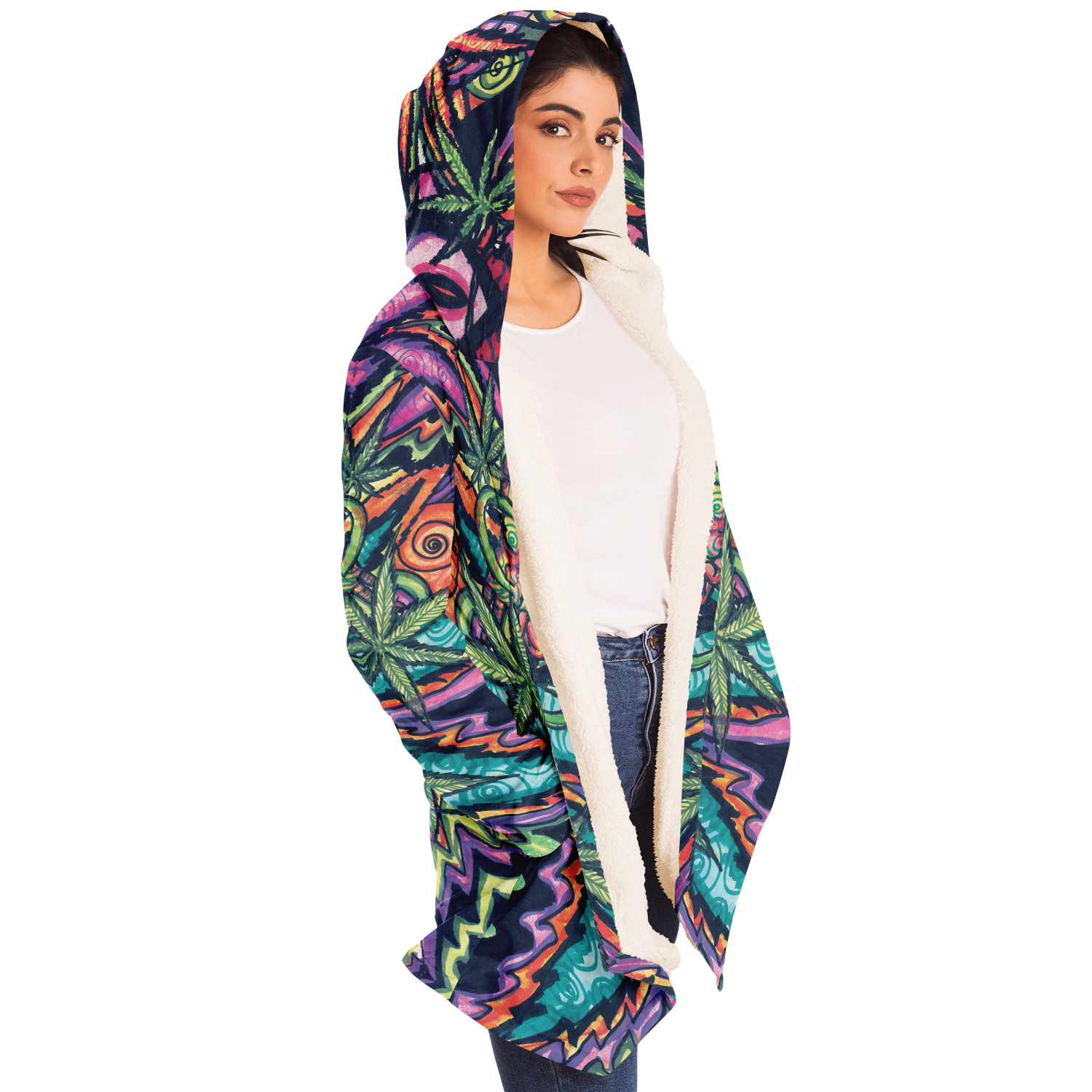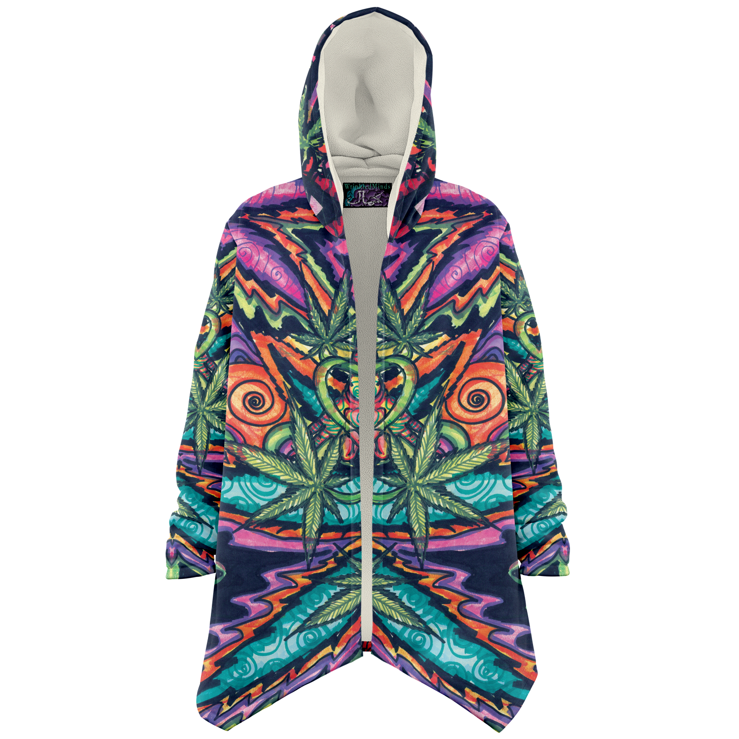 Made from 100% Micro-Mink Polyester, having a silky smooth surface. This allows every Art piece to stand out as one of a kind. Additionally, a layer of Microfiber Fleece is added.This semi plush fleece is buttery soft feeling that lines the torso, sleeves, and hood! Overall a medium weight build cloak with a large hood.