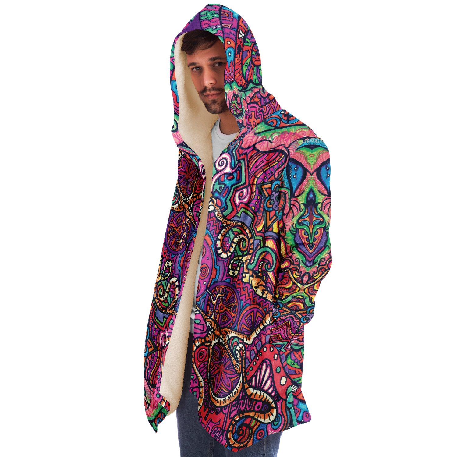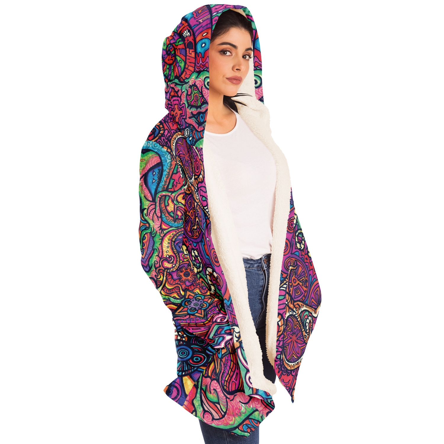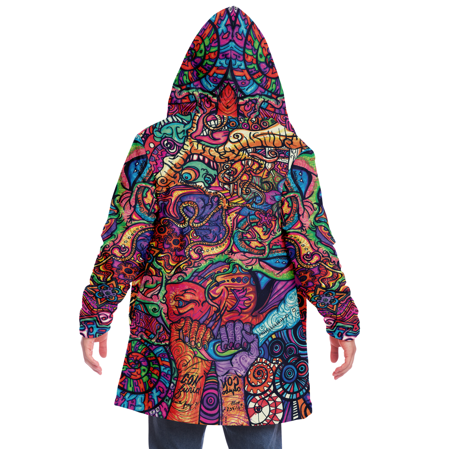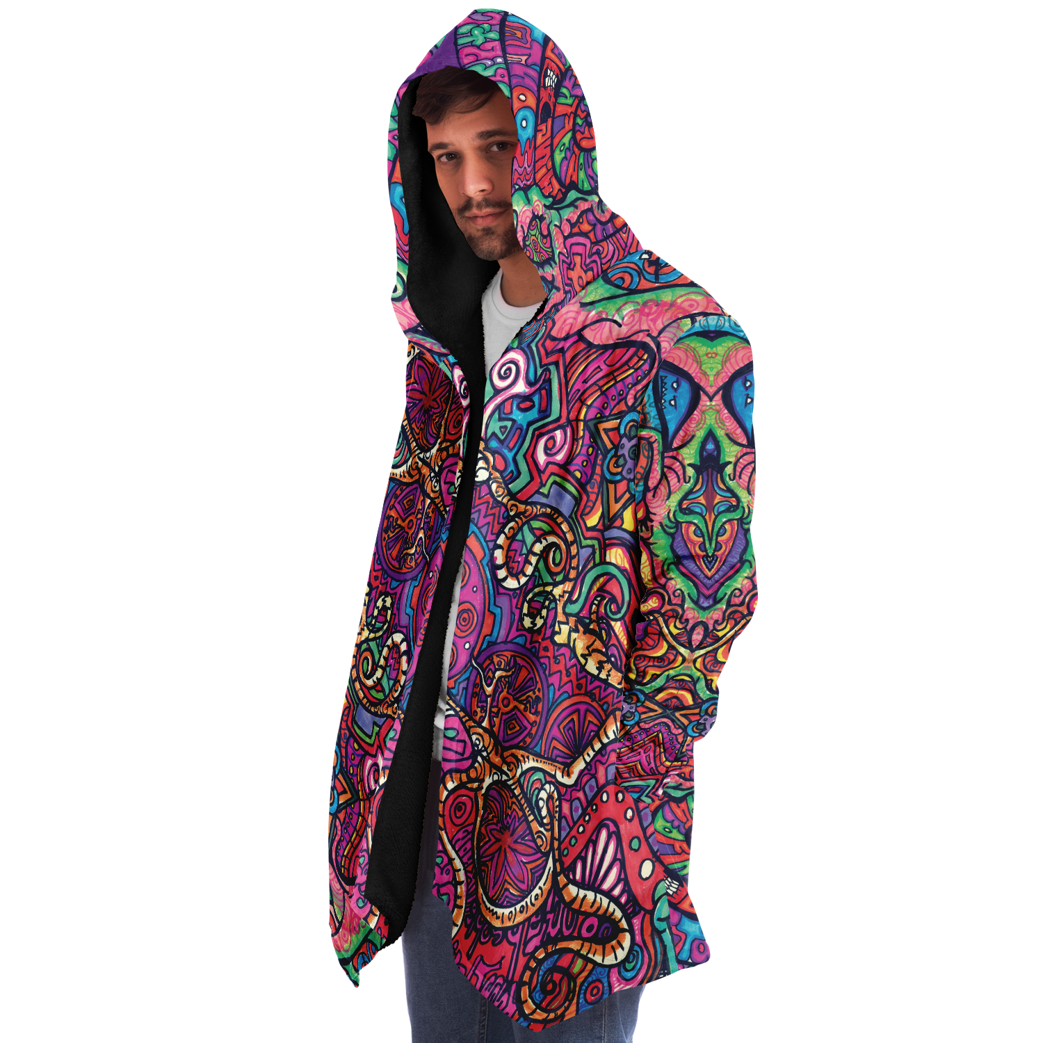 Made from 100% Micro-Mink Polyester, having a silky smooth surface. This allows every Art piece to stand out as one of a kind. Additionally, a layer of Microfiber Fleece is added.This semi plush fleece is buttery soft feeling that lines the torso, sleeves, and hood! Overall a medium weight build cloak with a large hood.