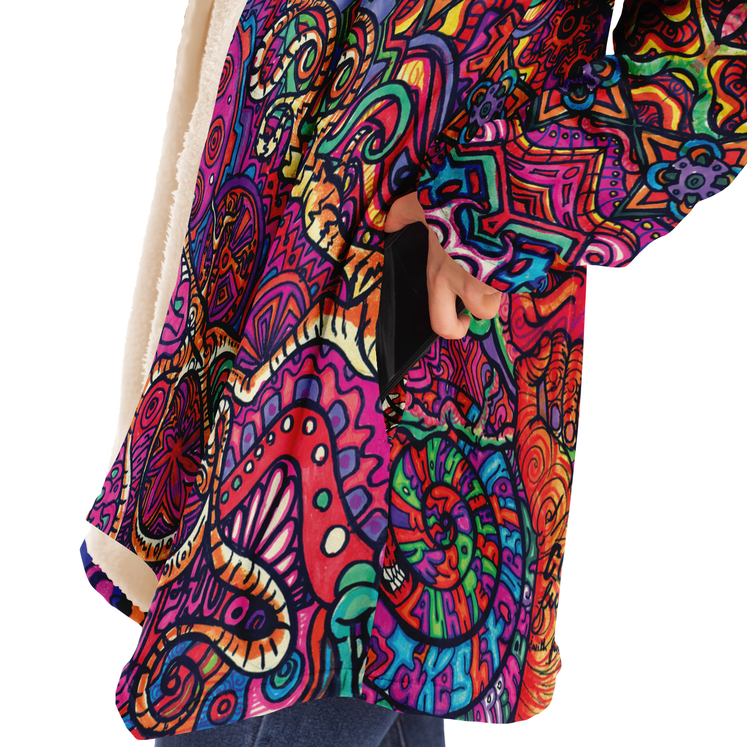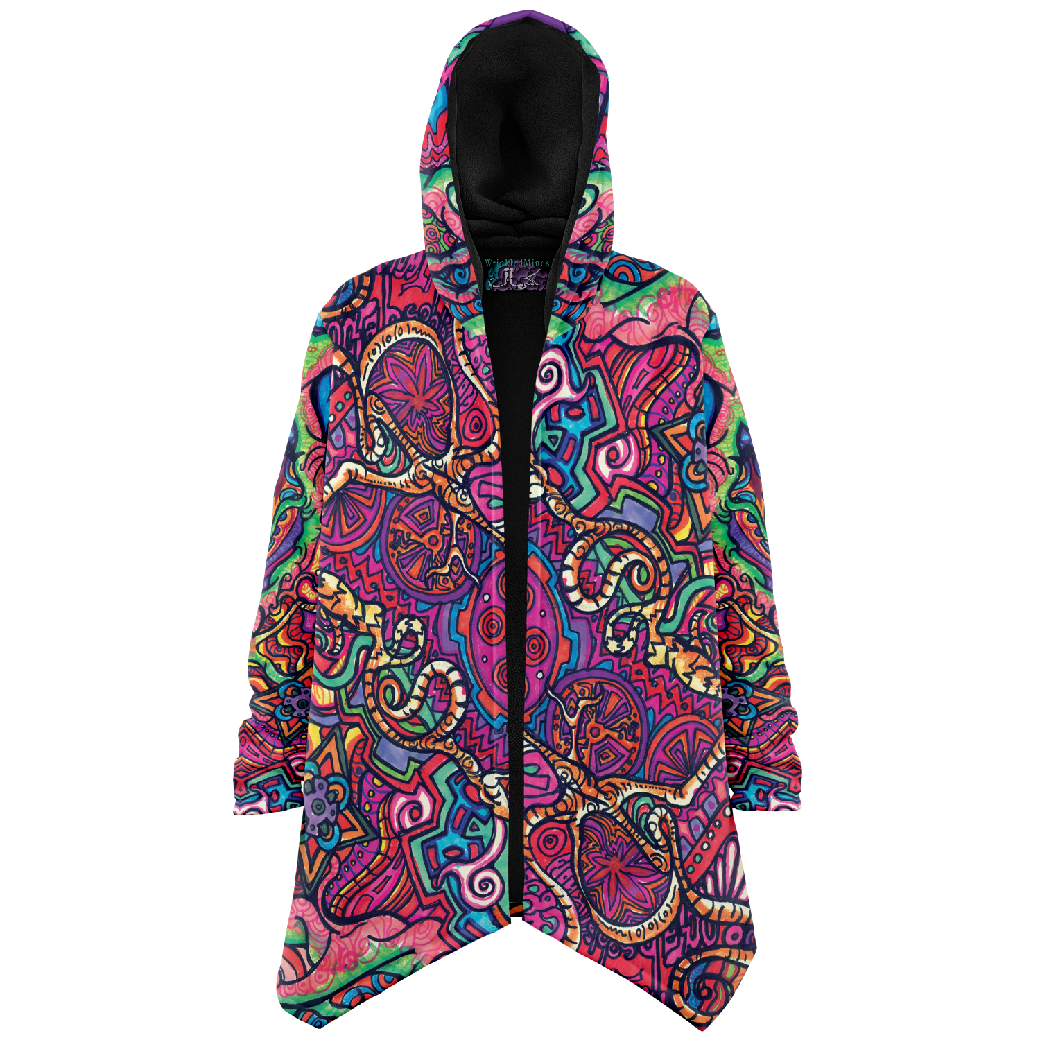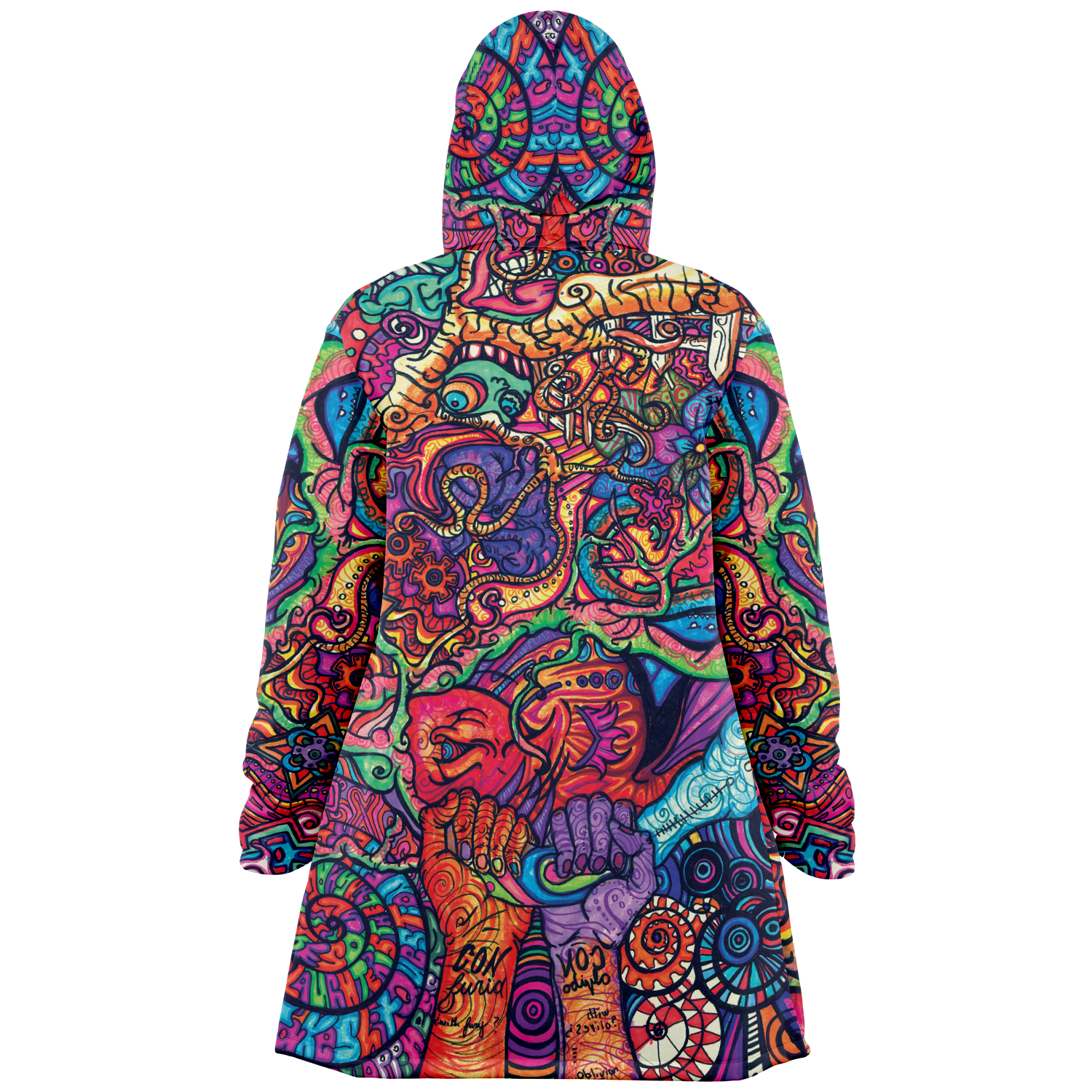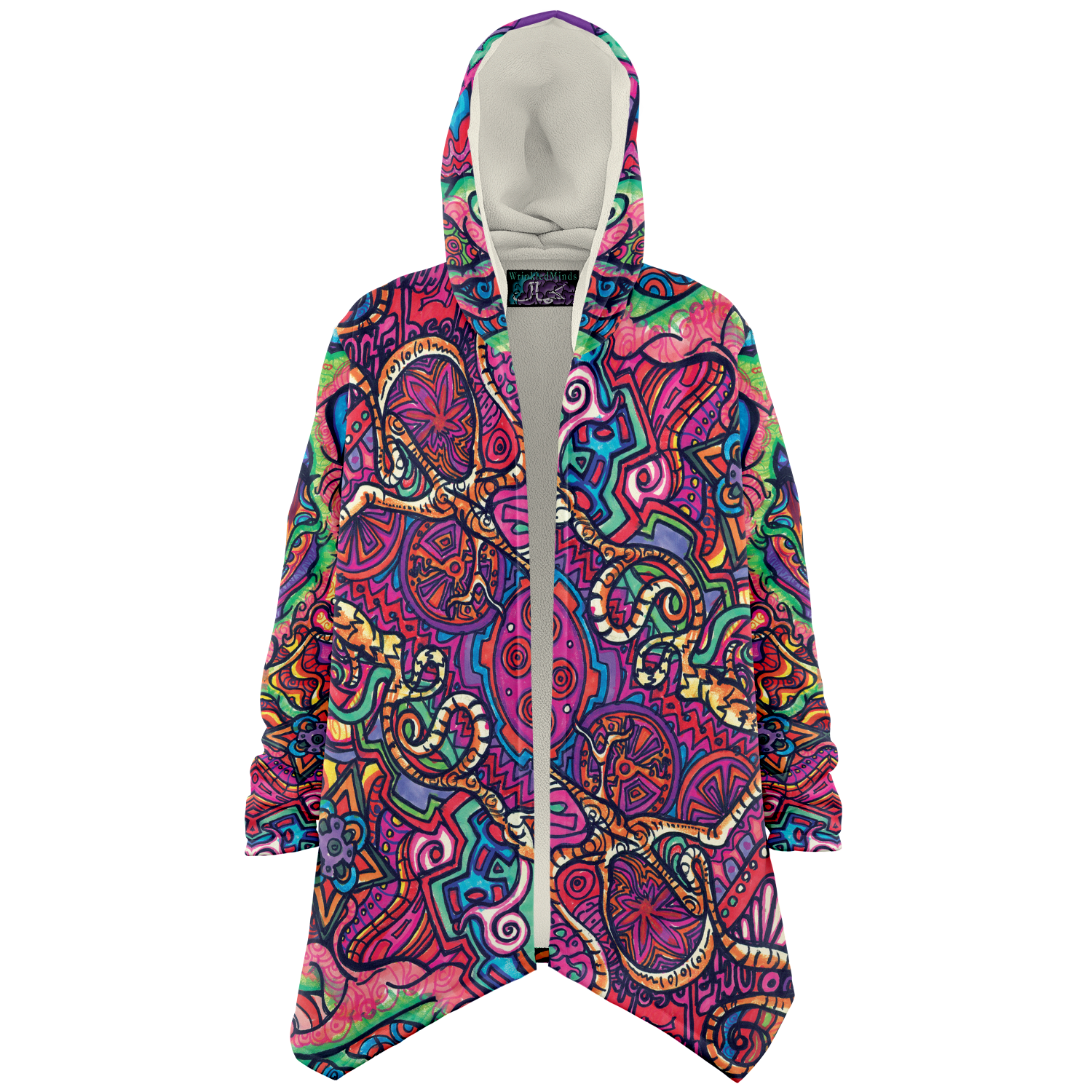 Made from 100% Micro-Mink Polyester, having a silky smooth surface. This allows every Art piece to stand out as one of a kind. Additionally, a layer of Microfiber Fleece is added.This semi plush fleece is buttery soft feeling that lines the torso, sleeves, and hood! Overall a medium weight build cloak with a large hood.