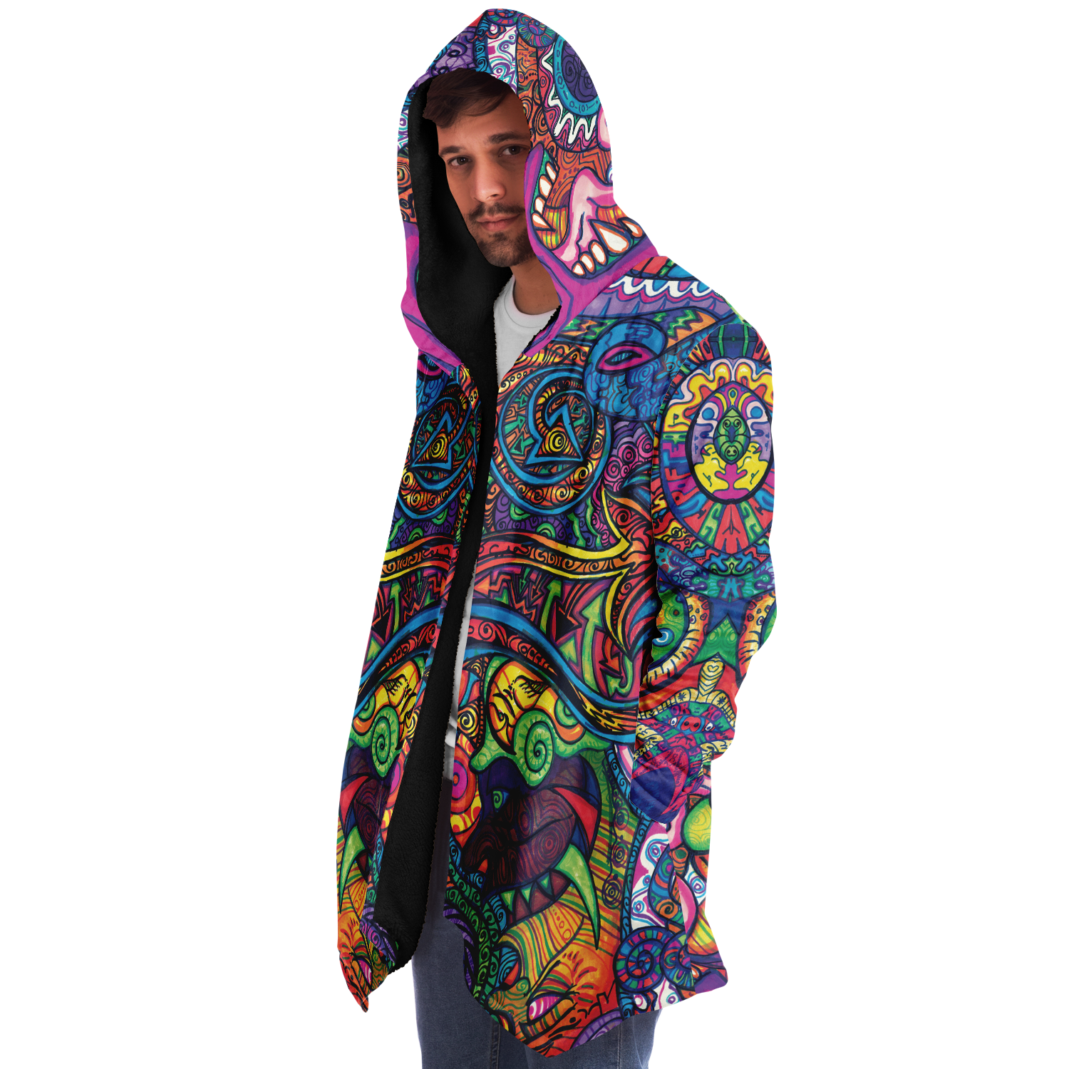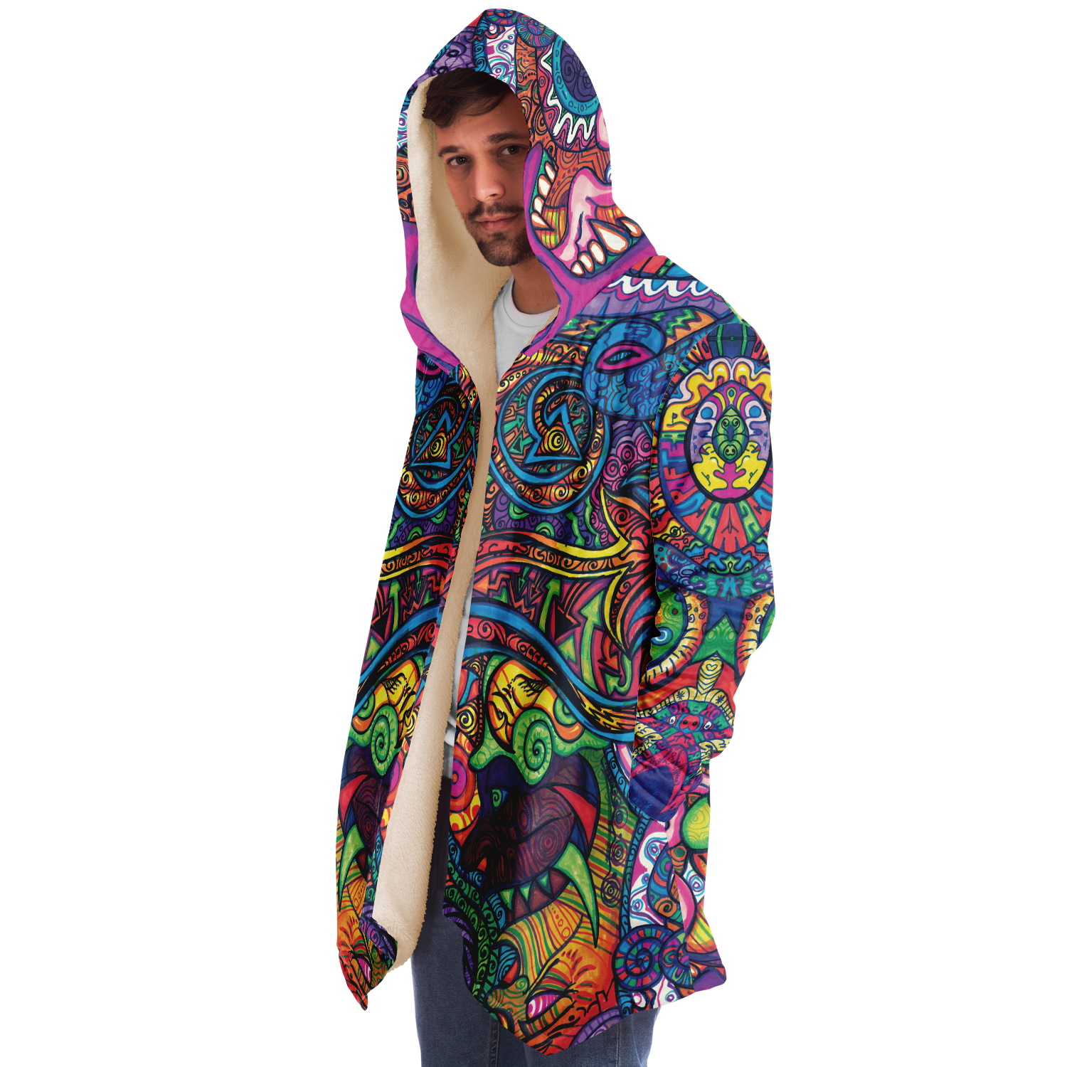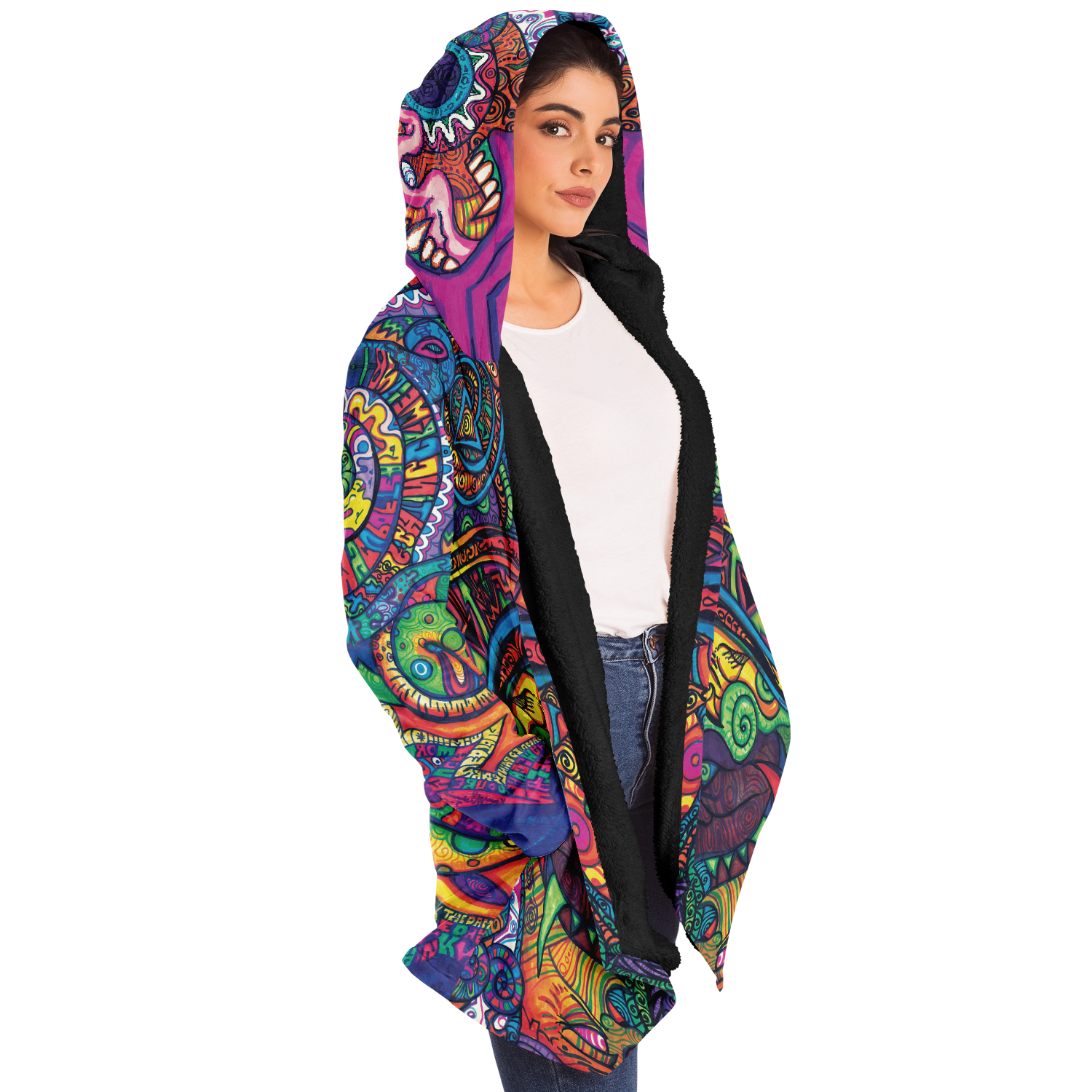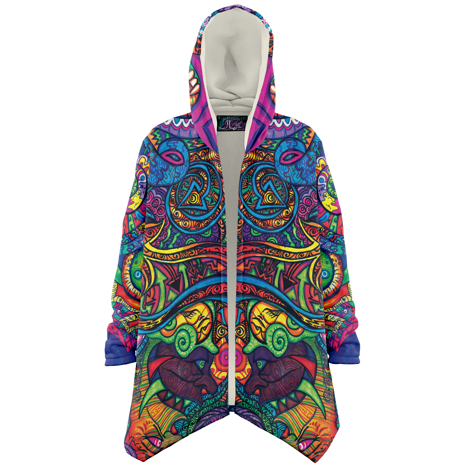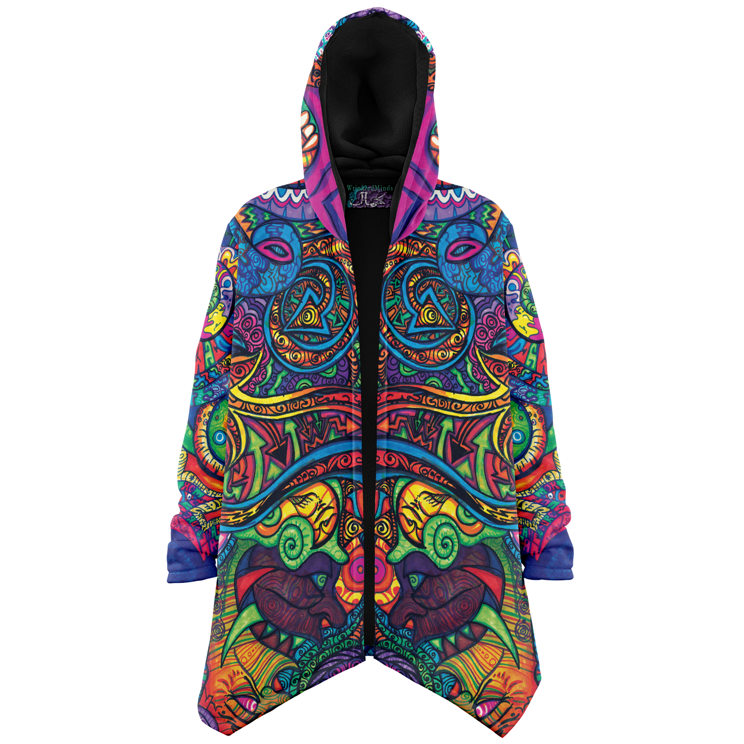 Made from 100% Micro-Mink Polyester, having a silky smooth surface. This allows every Art piece to stand out as one of a kind. Additionally, a layer of Microfiber Fleece is added.This semi plush fleece is buttery soft feeling that lines the torso, sleeves, and hood! Overall a medium weight build cloak with a large hood.