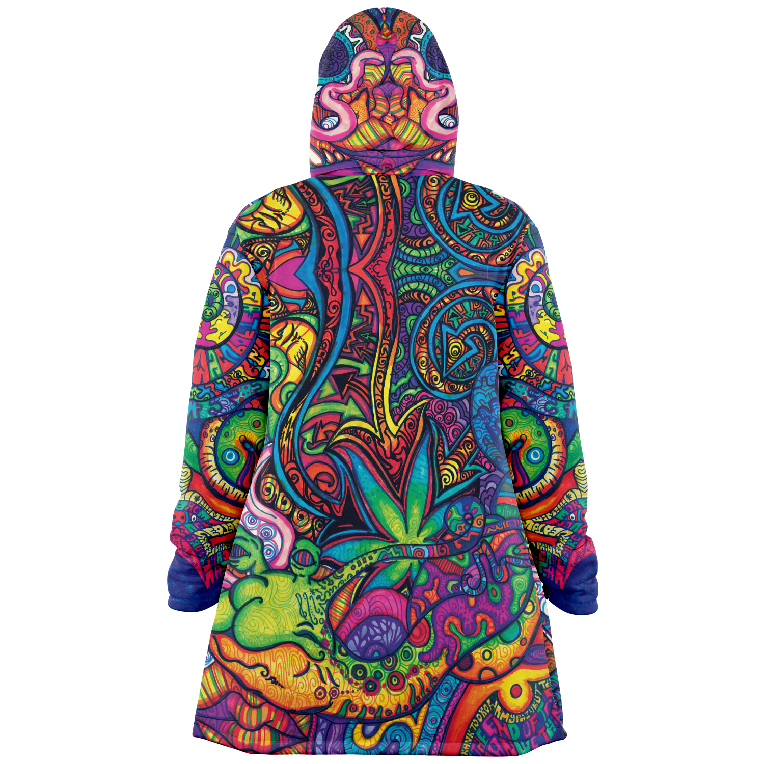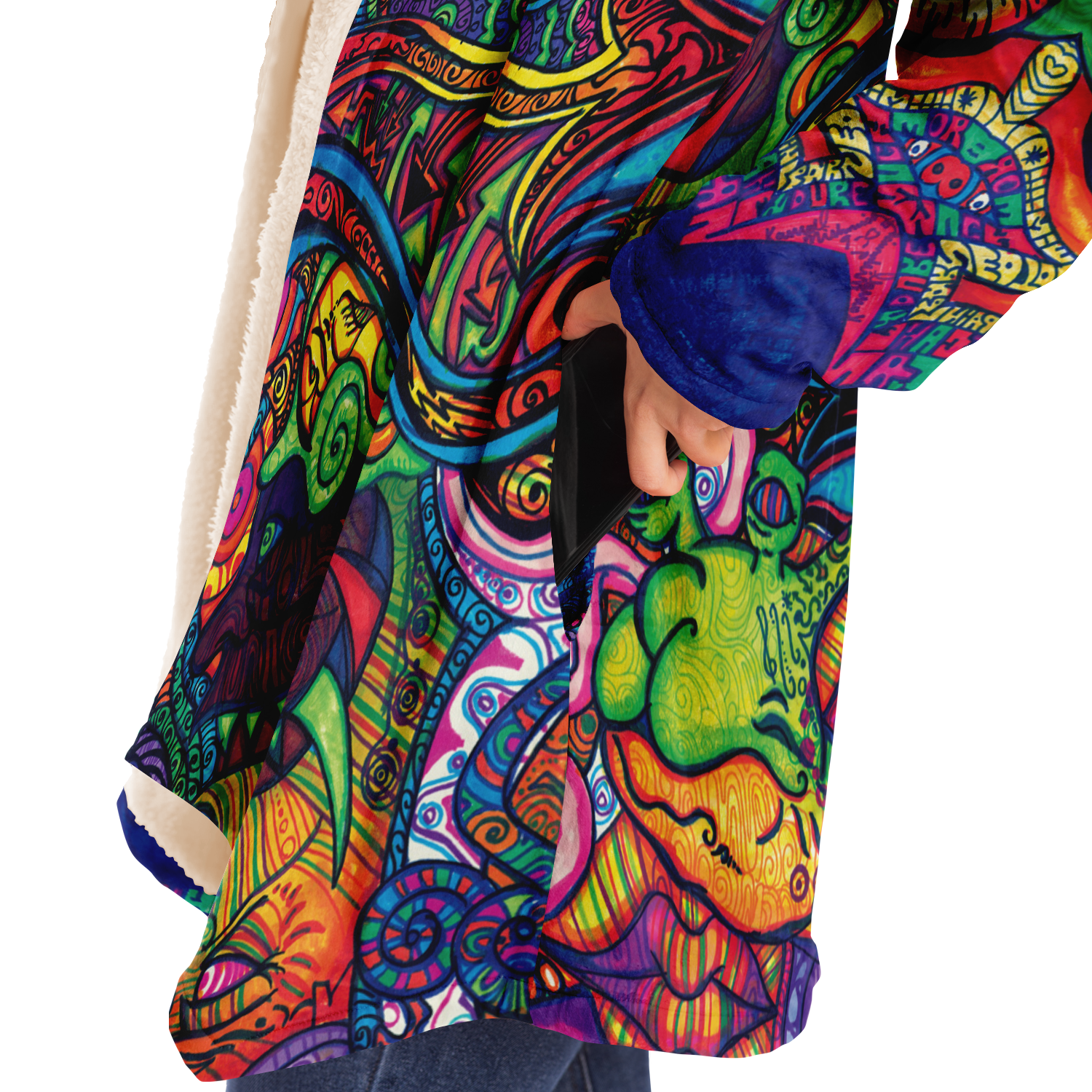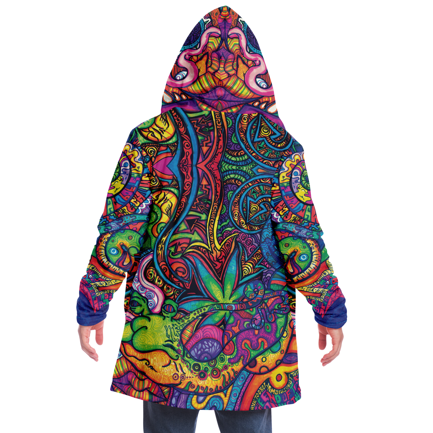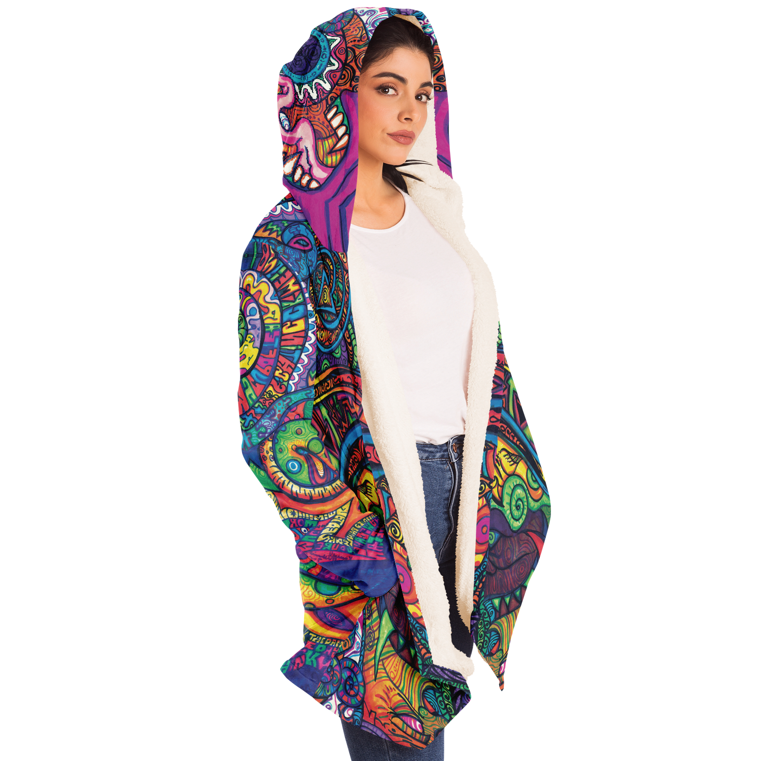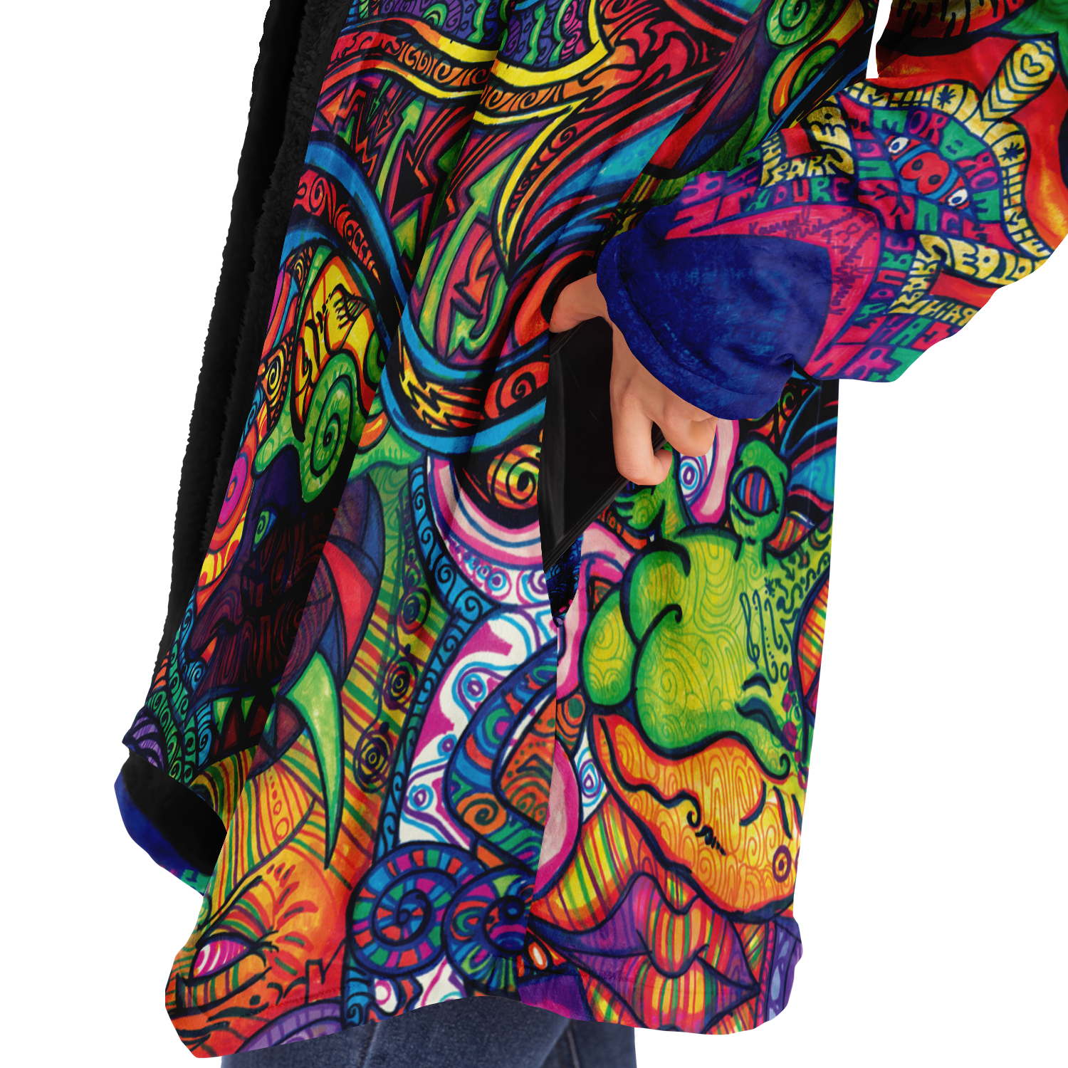 Made from 100% Micro-Mink Polyester, having a silky smooth surface. This allows every Art piece to stand out as one of a kind. Additionally, a layer of Microfiber Fleece is added.This semi plush fleece is buttery soft feeling that lines the torso, sleeves, and hood! Overall a medium weight build cloak with a large hood.