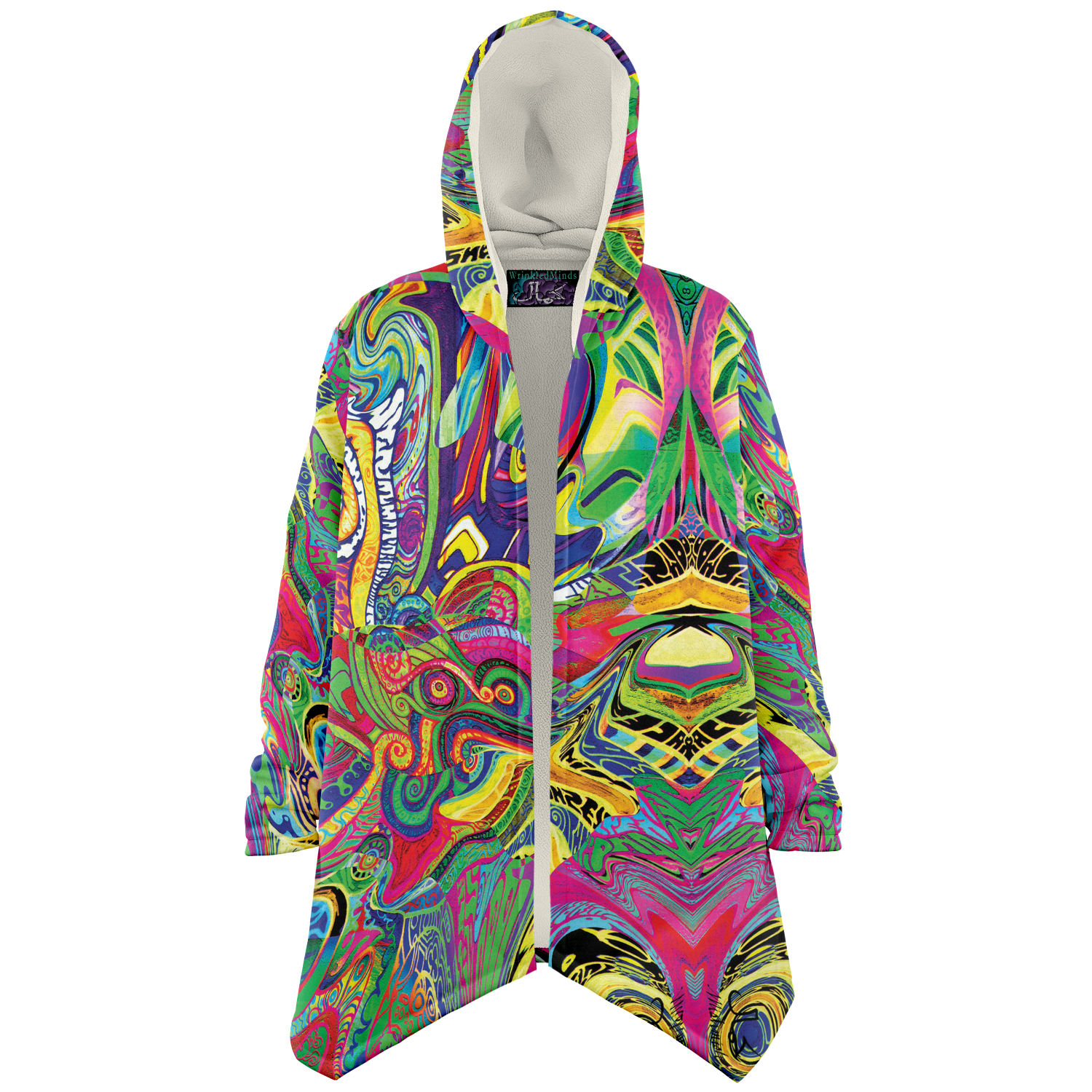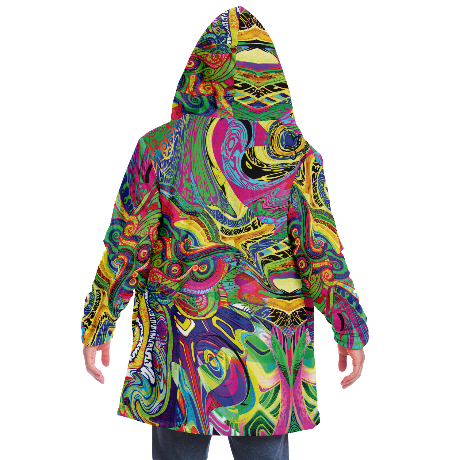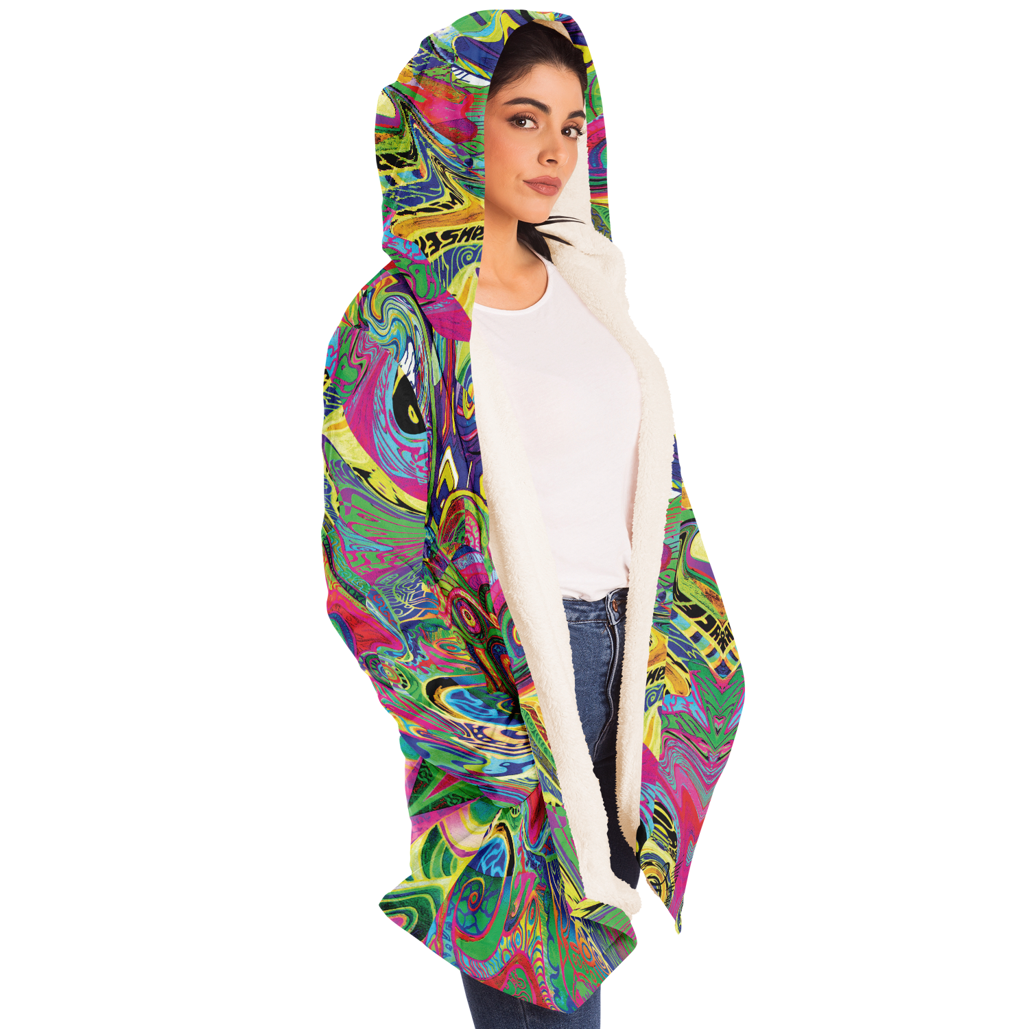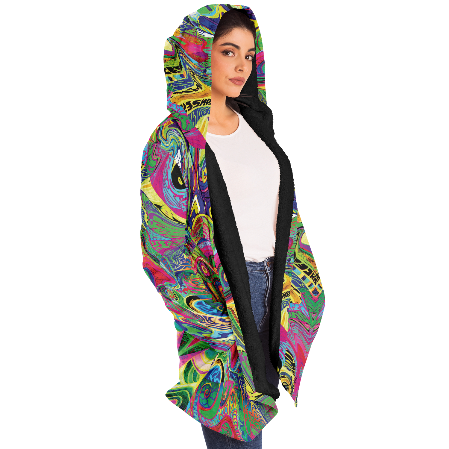Made from 100% Micro-Mink Polyester, having a silky smooth surface. This allows every Art piece to stand out as one of a kind. Additionally, a layer of Microfiber Fleece is added.This semi plush fleece is buttery soft feeling that lines the torso, sleeves, and hood! Overall a medium weight build cloak with a large hood.