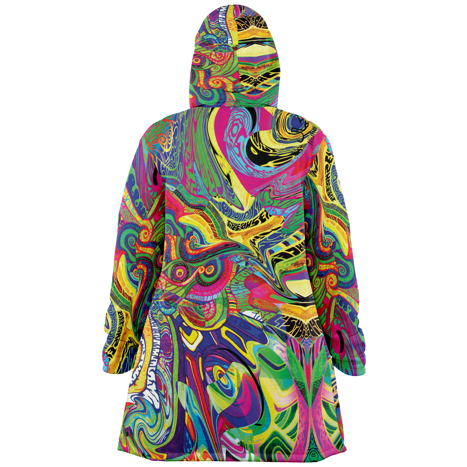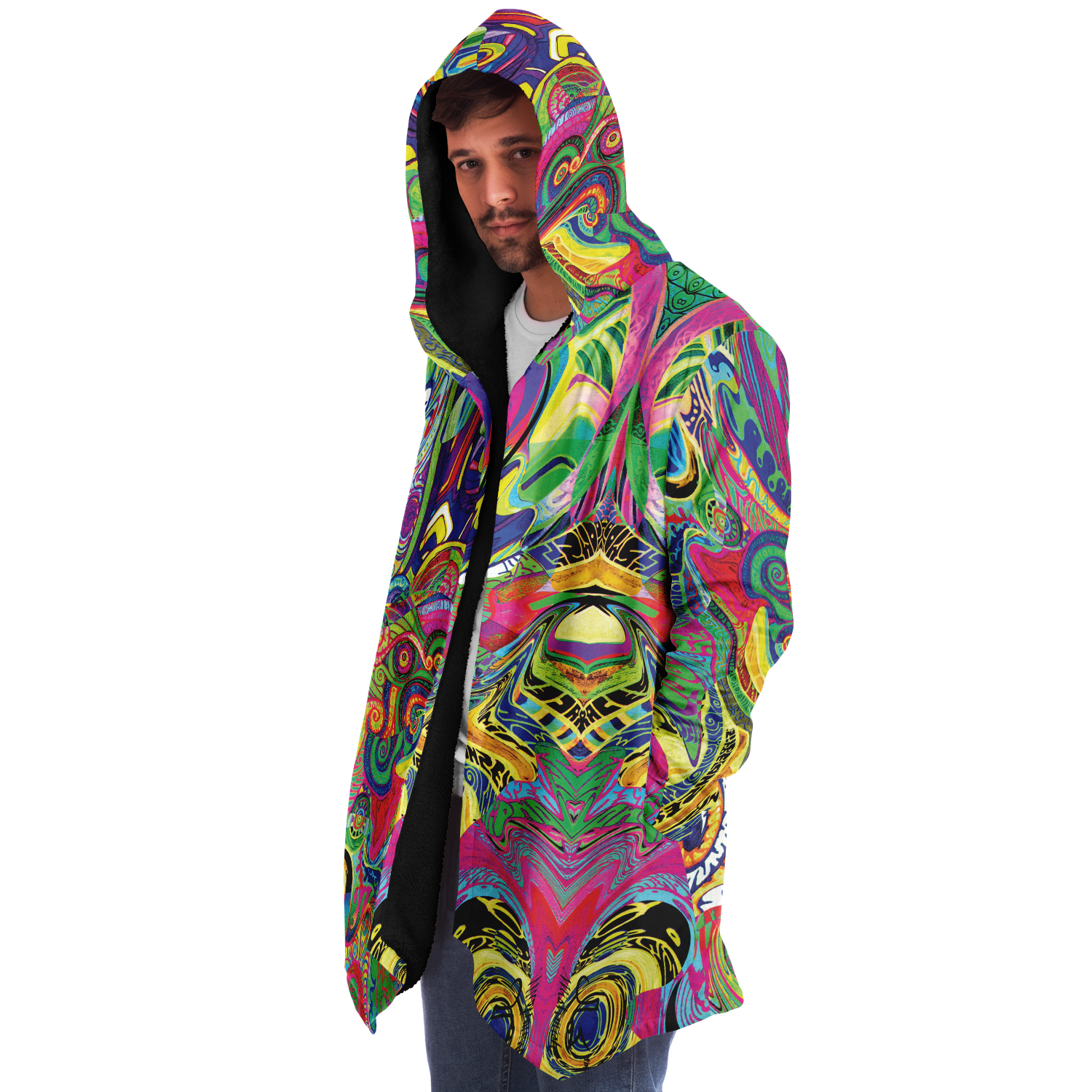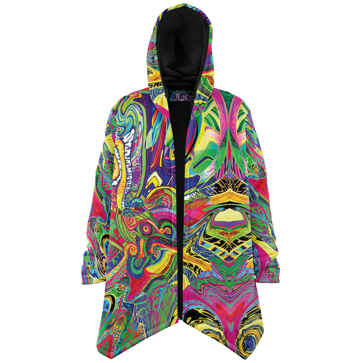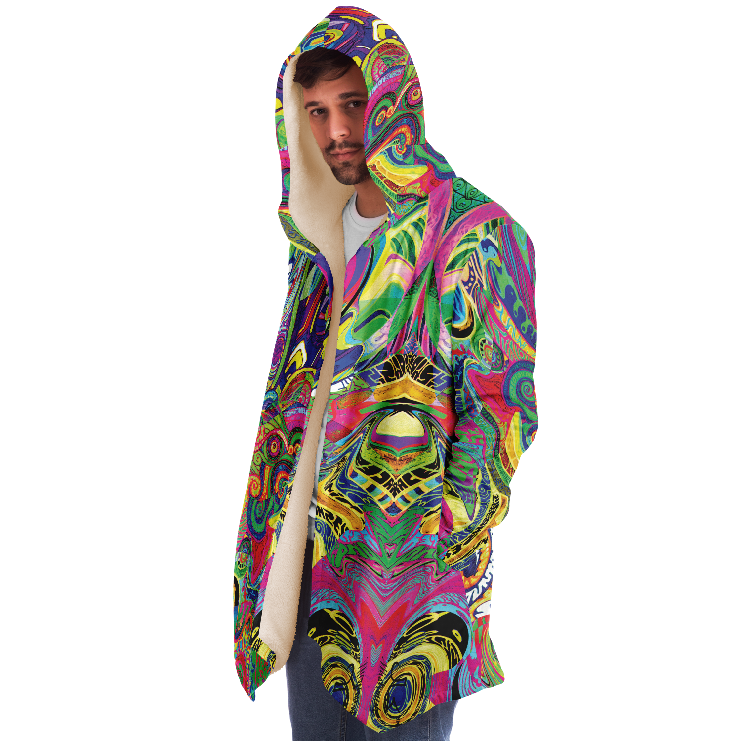 Made from 100% Micro-Mink Polyester, having a silky smooth surface. This allows every Art piece to stand out as one of a kind. Additionally, a layer of Microfiber Fleece is added.This semi plush fleece is buttery soft feeling that lines the torso, sleeves, and hood! Overall a medium weight build cloak with a large hood.